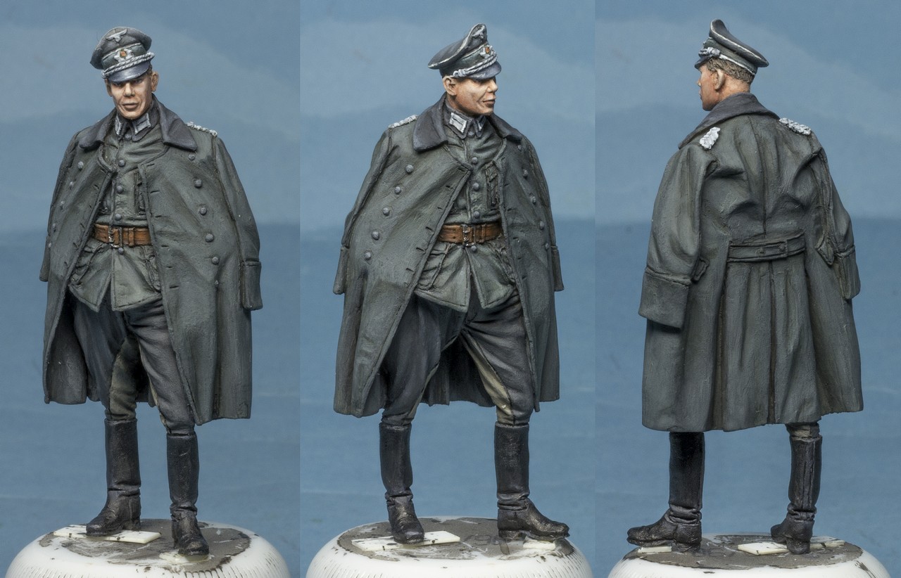 Шинель стоит выделить - она должна быть более зеленая, чем мундир.Воротник вполне уместно сделать темно-зеленым,а пуговицы белого металла. Для офицера с погонами минимум майора воротник мундира тоже бы в темно-зеленый перекрасить- такие мундиры до конца войны носили,особенно офицеры. Пуговицы на мундире даже если в защитной окраске, все равно по цвету должны от ткани отличаться.