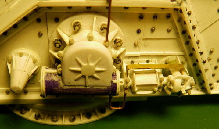 barsiq, Немного не понял вопрос. Вилка сделана в виде буквы П с заоваленными краями вверху. По центру разрез, вставлена пружина, на ней крепится ось катка и снизу зафиксирована накладкой. В верхней части вилки тоже ось,которой она крепится в кронштейне в коробе.А почему так сделано, это вопрос к конструкторам орудия. Конусы здесь сделаны очень просто. Подобраны от окончаний пластиковых авторучек. А внутрь вставлены вставки из полистирола.Если же не могу подобрать, то просто точу на токарном станке.