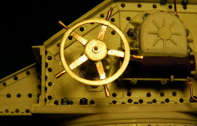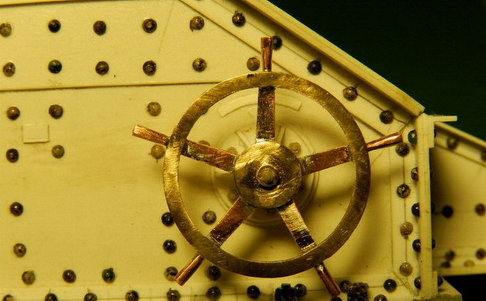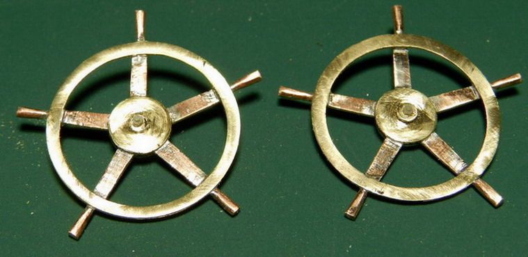 Наконец-то я вернулся к строительству модели. Из латуни выточил ободы и центры для маховиков подъёмного механизма. Из медной проволоки проковал рукояти и спаял маховики.