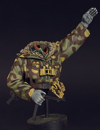 Мысль о подставке под немца в 16 масштабе. Сейчас выпустили серию-партворк по сборке "Тигра" в 16м, детали из металла. Сам по себе проект для миллионеров, но первые 2 номера по 99 рублей - там ствол с маской, крыша башни и ее скулы. Можно обрезать башню наискось, поставить заглушку там, где ее "обрежет" подставка, а на оставшуюся "полубашню" с торчащей пушкой водрузить фигуру.