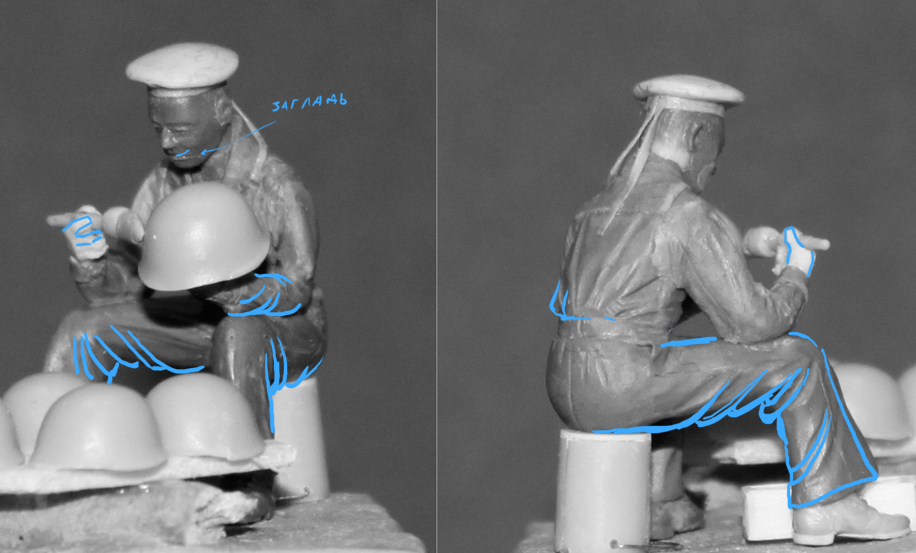 Голова.По возможности чуть-чуть повернуть в сторону каски(это простой вариант)или более детально проработать глаза и при росписи сделать скошенные в сторону каски зрачки(более сложный вариант не факт, что получится)Посмотри внимательно место вокруг рта.Можно более детально проработать уши(на такой фигуре они очень заметный и важный элемент.
