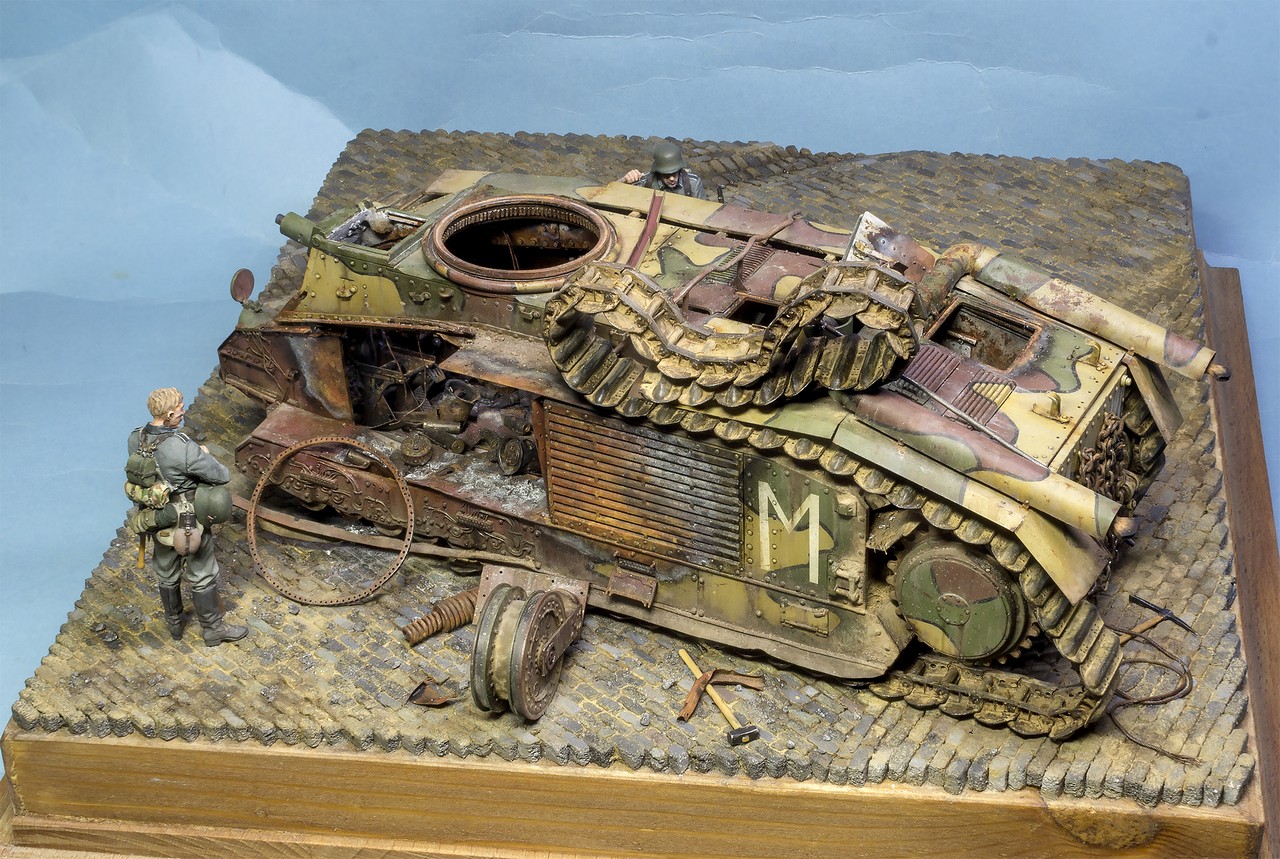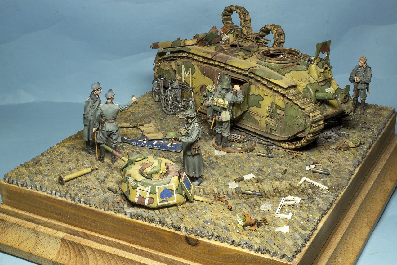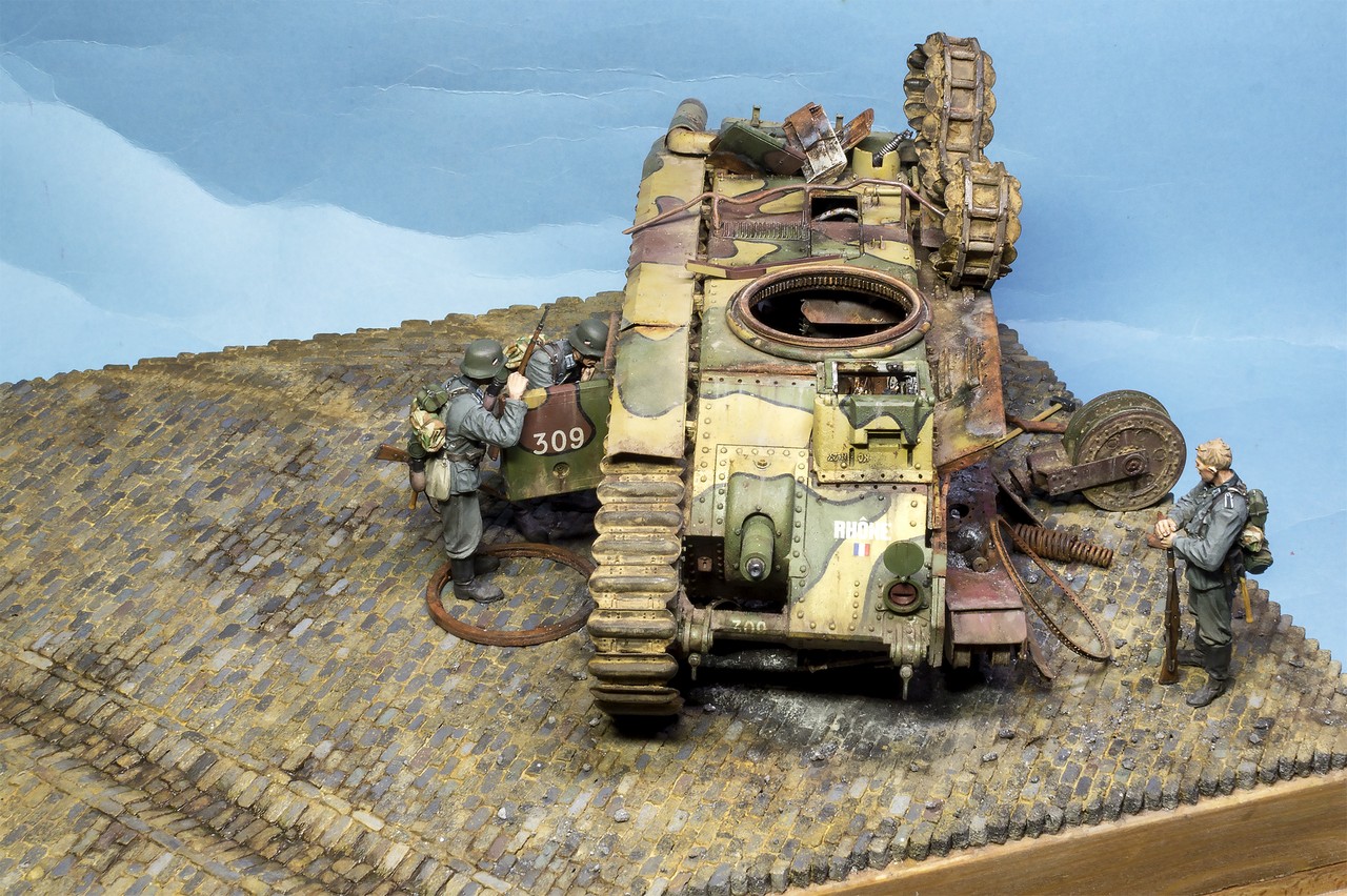 Танк, нужно поставить развороченным боком к "зольдатенам", плюс ко всему - придвинуть его ближе, тогда - "металлолом" получит больше воздуха от левого края и займёт пропорциональное расстояние, к обозревающим вид "нанесённого ущерба" фигуркам. Угол "танка", оставьте тем-же.