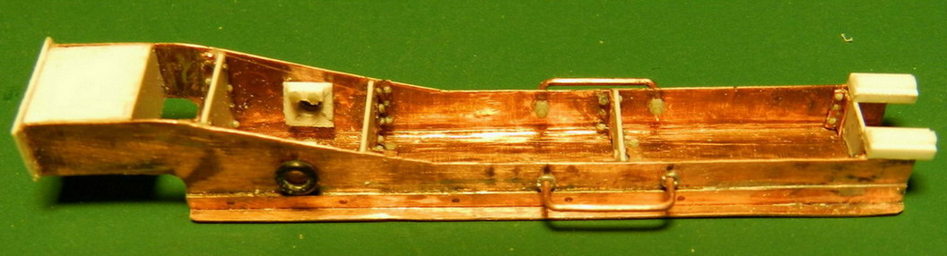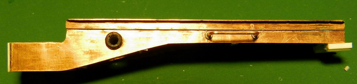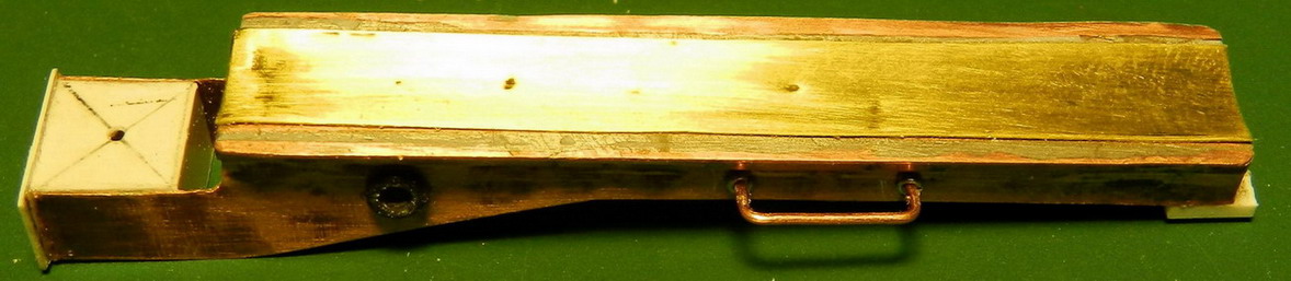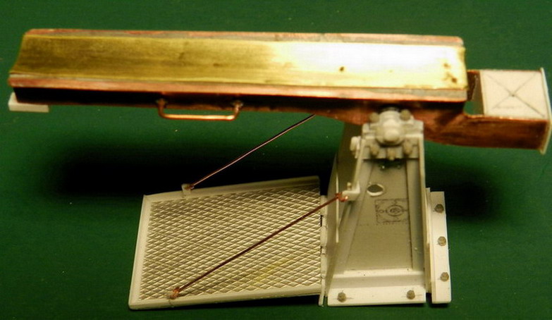 Работа потихоньку продвигается. Сделал устройство для подачи снарядов при заряжании. Вначале собственно лоток. Из меди, латуни и полистирола. Верх должен оставаться латунным, не крашеным.