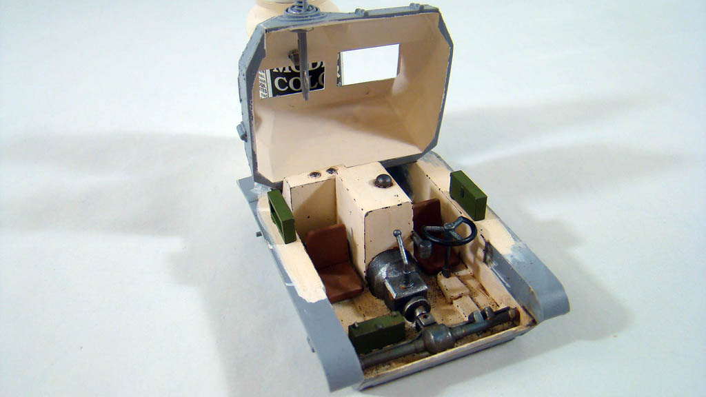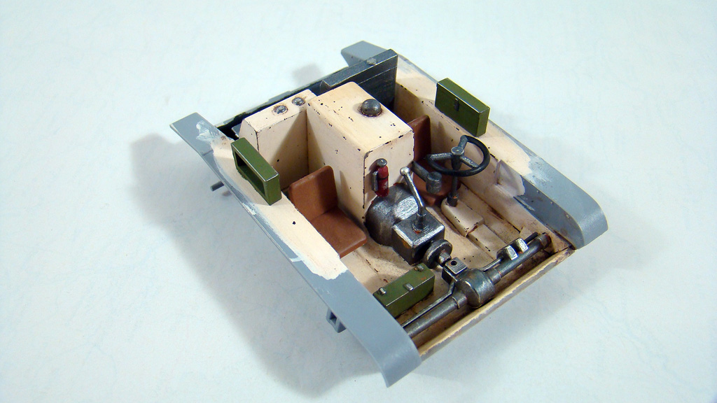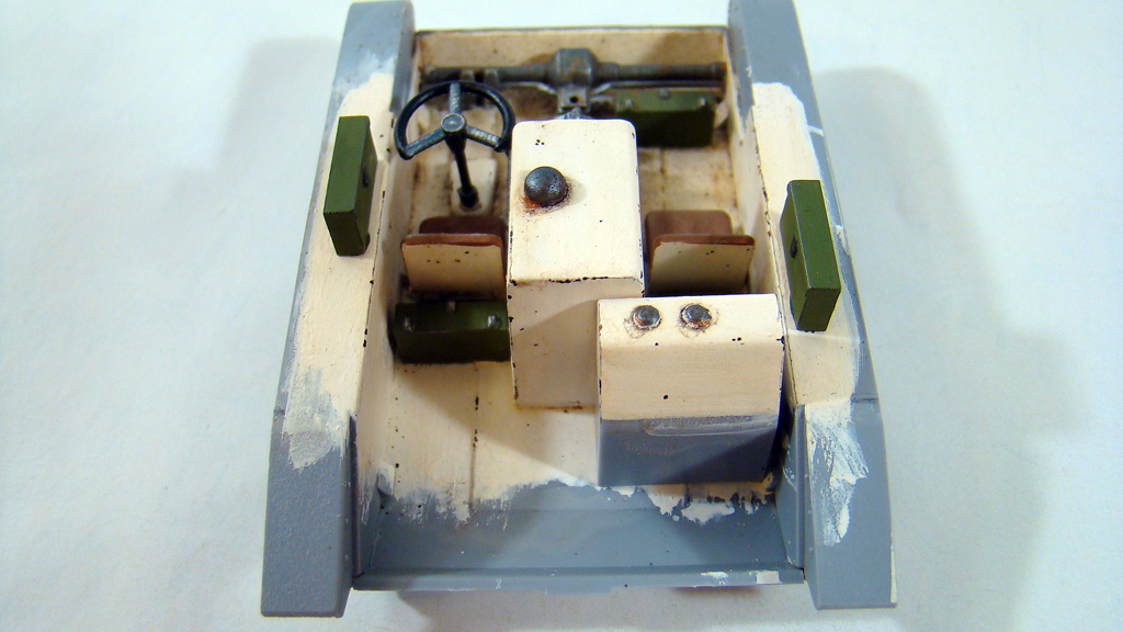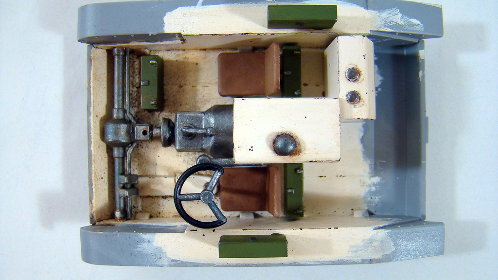 Начал красить интерьер, основной цвет LIGHT FLESH от валеджо, сколы ощипанной тонкой кистью (смотри фото) довольно интересным цветом smoke ,сиденья краской хома ящики оливково-зеленым от хобби нитра, на достоверность цветов не претендую, скорее это как я его вижу .После кое где прошелся карандашом и тамиевской пудрой, и совсем чуть чуть ржавчины .И в конце смывка коричневым маслом.(верх рубки показан без смывки) Да красил по жаре, где то 35 градусов было в помещении как минимум, краска вела себя очень неестественно как кисель..я уже давно подметил что жара губительно сказывается на покрасочных работах.