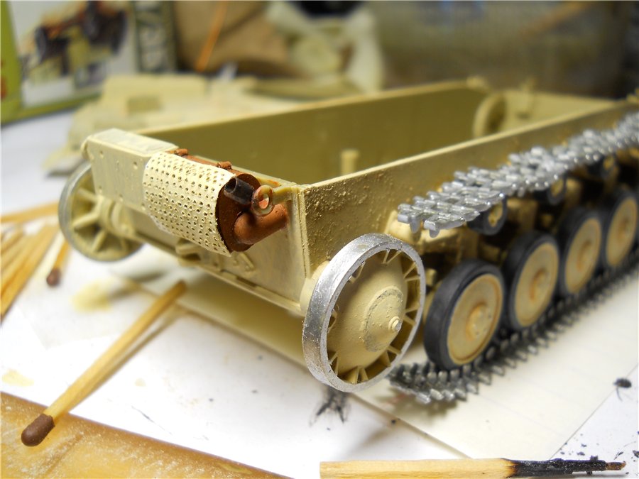 Собрал гусеницу, пока на одну сторону. Ох и не легкое это занятие чистить пластиковые траки. Кто работал с ними-поймет. На танке испытываю технику сколов методом карандаша. Может немного увлекся, но это пока -проба пера так сказать. Так же изготовил имитацию сетки на выхлопной трубе, делал из бумаги, пропитанной клеем. И еще, вопрос в догонку-синим цветом на фото написан номеры машины. Кто знает, скажите пожалуйста, к какой дивизии могла относится машина ?