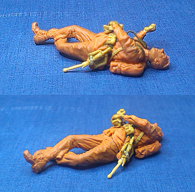 Попытка сделать ремни из зелёнки, кажется, удалась. Толщина ремня - 0,12 мм. После изготовления по выкройке всех деталей и их застывания, резиновость материала позволила придать снаряжению нужную форму и подогнать по месту. Патронные сумки, малая пехотная лопата, штык, кисти рук, кепи и скелет фигурки - из жёлтой Тамия, огромное спасибо Александру Зеленкову. Плечи попробовал сделать так, как он советовал в посте №5.