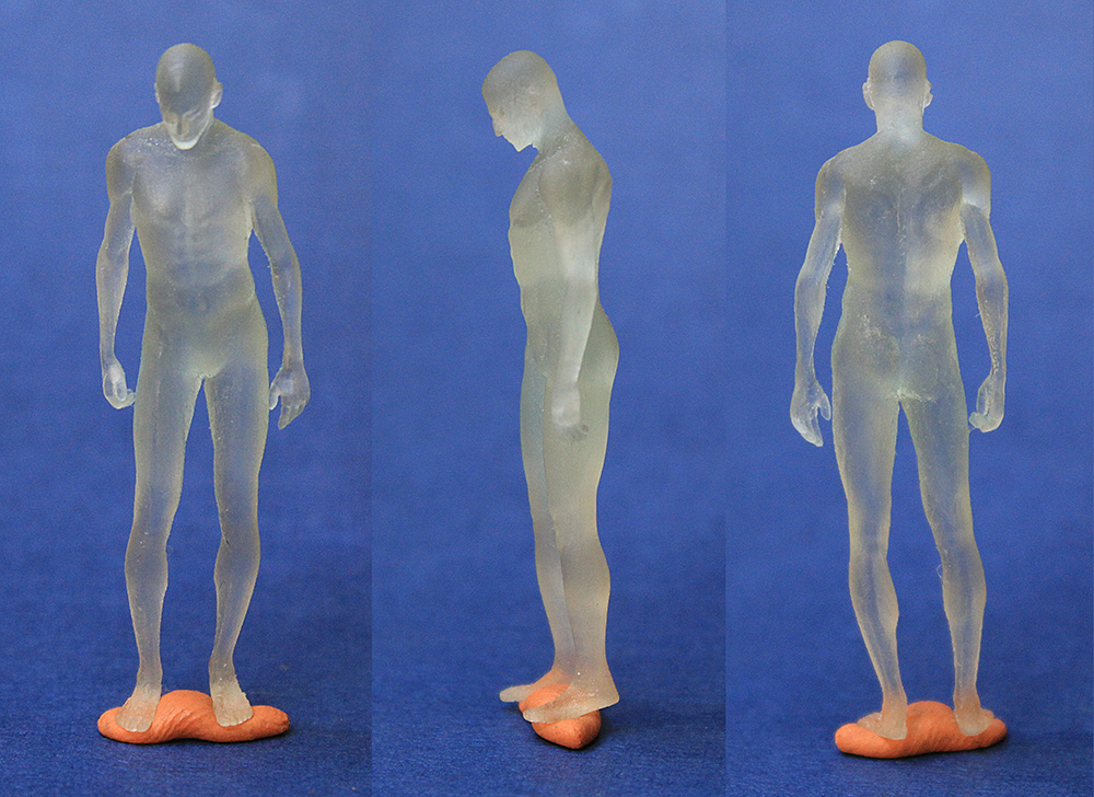 Сварганил 3D модельку. Перед тем как её одевать, чтобы не тратить времени понапрасну, попробовал вырастить. Высота фигурки - 50мм. Растили на Objet Eden 250. И разрешение у него хорошее, а качество получилось… То-ли не повезло, то-ли одно из двух… Первое – при печати фигурку положили на спину. Соответственно вся она пошла ступеньками в рост. Не удались уши, глаза, нос, рот...