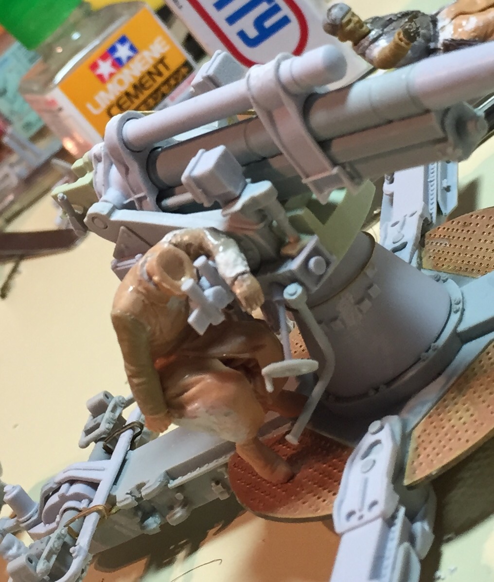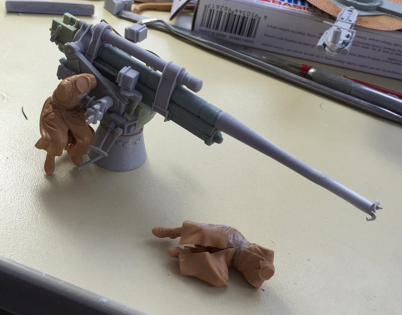 Медленно, но верно илет построение зенитки.. Скажу как есть- сплошной обман!! Вместо отличного качества литья из смолы- детали со смещениями, облоем, металлического ствола просто не оказалось в наборе! Об инструкции- я промолчу.. Ужас:) тем не менее, работа идет.. Отрезал ствол, нарастил секцией от автомобольной антенны, "разорвал" стаол.. Грунтовка покажет где нужно доработать место соединения!