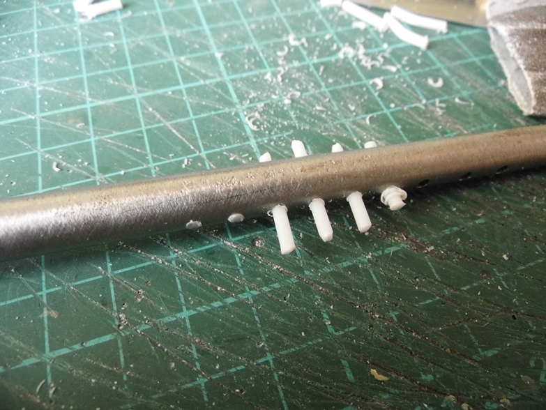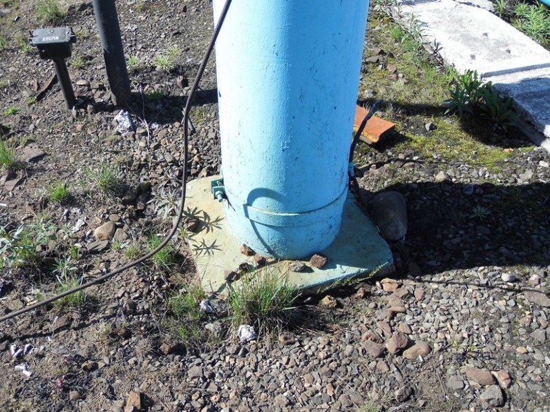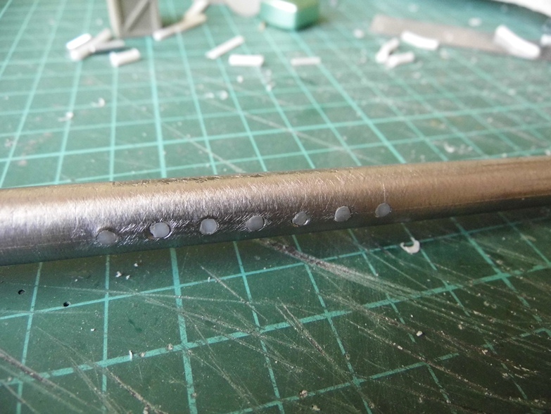 Как Вы уже видели на предыдущих фото опор к/сети мне их выточили из металла. Отверстия просверлены в нужных местах, но диаметром 2 мм. На настоящих ж/б опорах закладные отверстия имеют диаметр 26мм. В переводе на 1:35 - это 0,74 (0,8 будет в полне нормально).