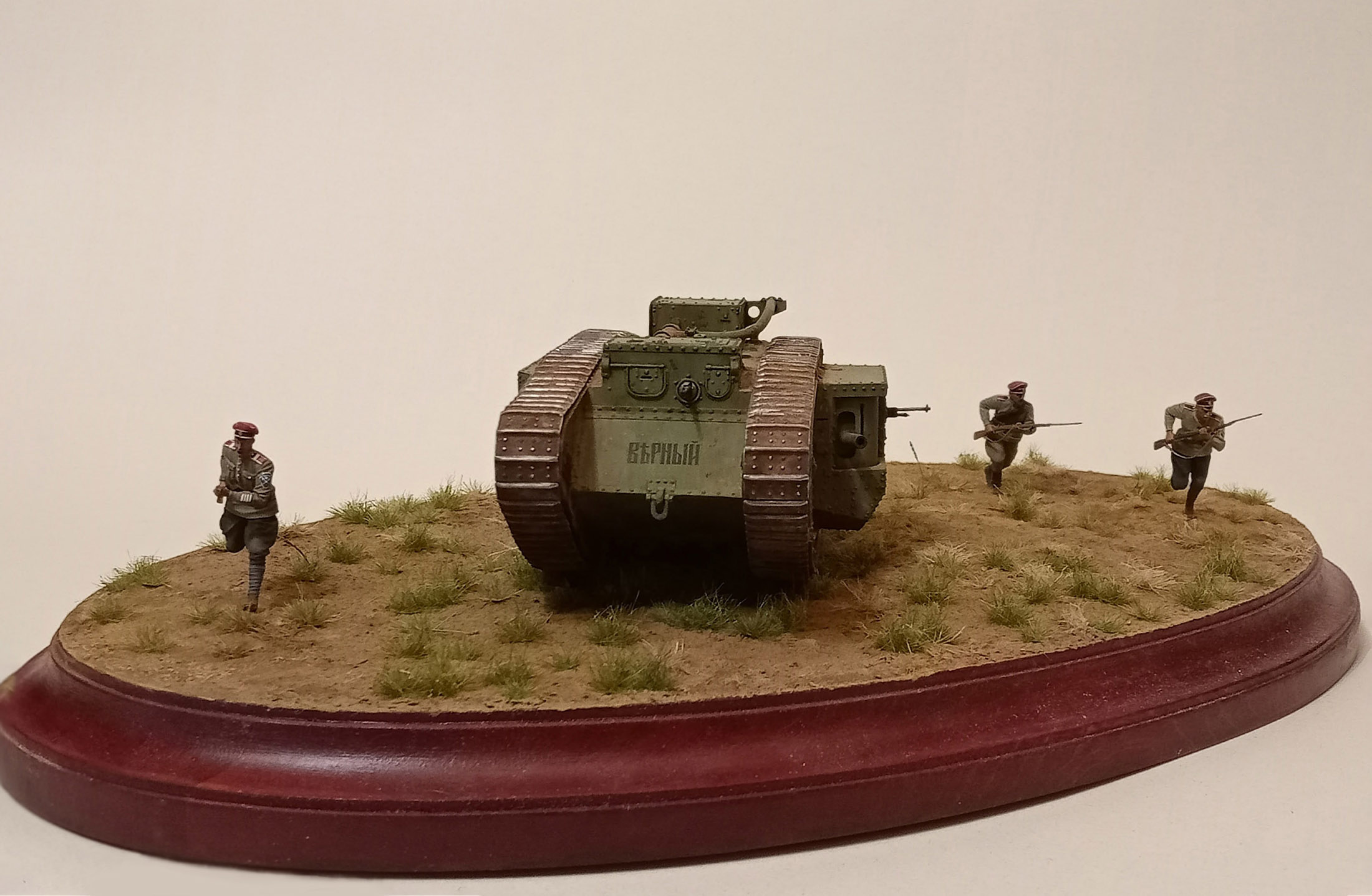 На диораме я изначально планировал отразить момент прорыва проволочных укреплений. Потом так и сяк покрутив и порасставляв танк и фигурки понял, что 100% реалистично этот момент на таком ограниченном пространстве не покажешь. Либо ставить один только танк, по тому, что я не думаю, что солдаты шли настолько близко вслед за ним. В общем пока я в раздумьях. Если допустить определённую условность, то в принципе можно показать всё это на одной диораме, а именно: впереди танк, уже прорвавший заграждения и немного отъехавший от них (очень немного), а за ним в брешь устремляются солдаты.