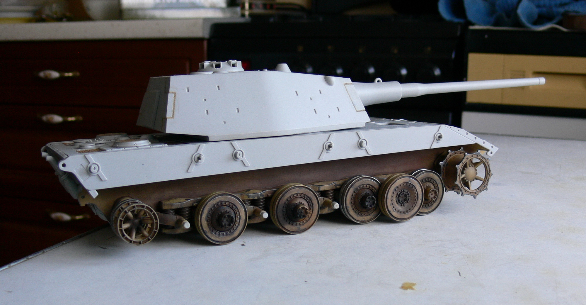 Соображенике такое: маслом и ржавчиной не увлекаться. Трактор в этом не пример. Трактора работают годами и даже десятилетиями. Танки на войне живут несоизмеримо меньше. Например, "Королевский тигр" этой модификации даже теоретически не мог прожить и года (производство начато летом 1944-го). А реально - пару месяцев. За это время он сильно не заржавел бы. Течи масла появляются при износе сальников от очень долгой работы. А вот угваздаться грязью по самую башню можно за минуту - лишь бы лужа поглубже была. Тем более, что основной период эксплуатации этих машин пришёлся на осень-зиму-весну.Джинн Wrote:Продолжаю ходовую. Цель-как у гусеничного трактора...в масле, ржавчине, пыли. Если есть у кого какие соображения?