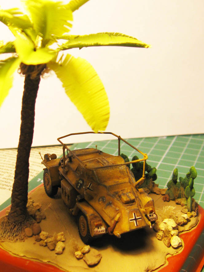 С верху дерева немного добавил сан технического льна. Из него же высадил сухие кустики травы среди камней и кактусов.