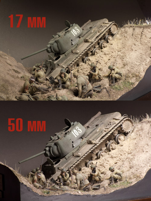 Прикинул я и возможности макрообъективов выставив на зуме 50 мм. Да, это вполне удачное фокусное для фотографирования ростовой фигурки во весь кадр - и перспектива ещё есть и искажений из-за небольшого фокусного уже нет. Фото фигурок получается вполне удачные - есть смысл покупать для этого макрик. Но диорамы! Фокусное 50 мм никуда не годится для диорам среднего размера - вся перспектива собирается в кучу, будто снято телевиком - вообще неживая картинка (см. сравнительную фото).