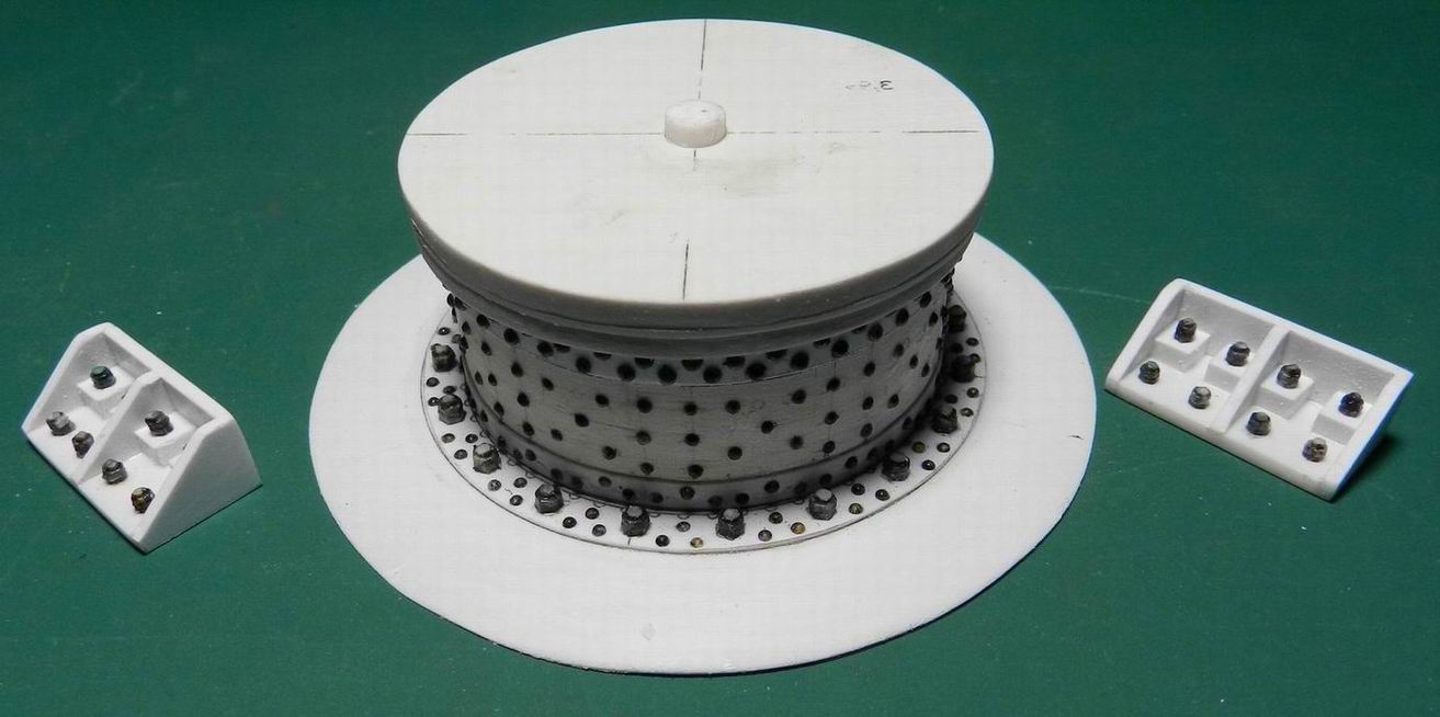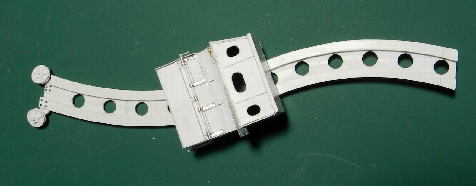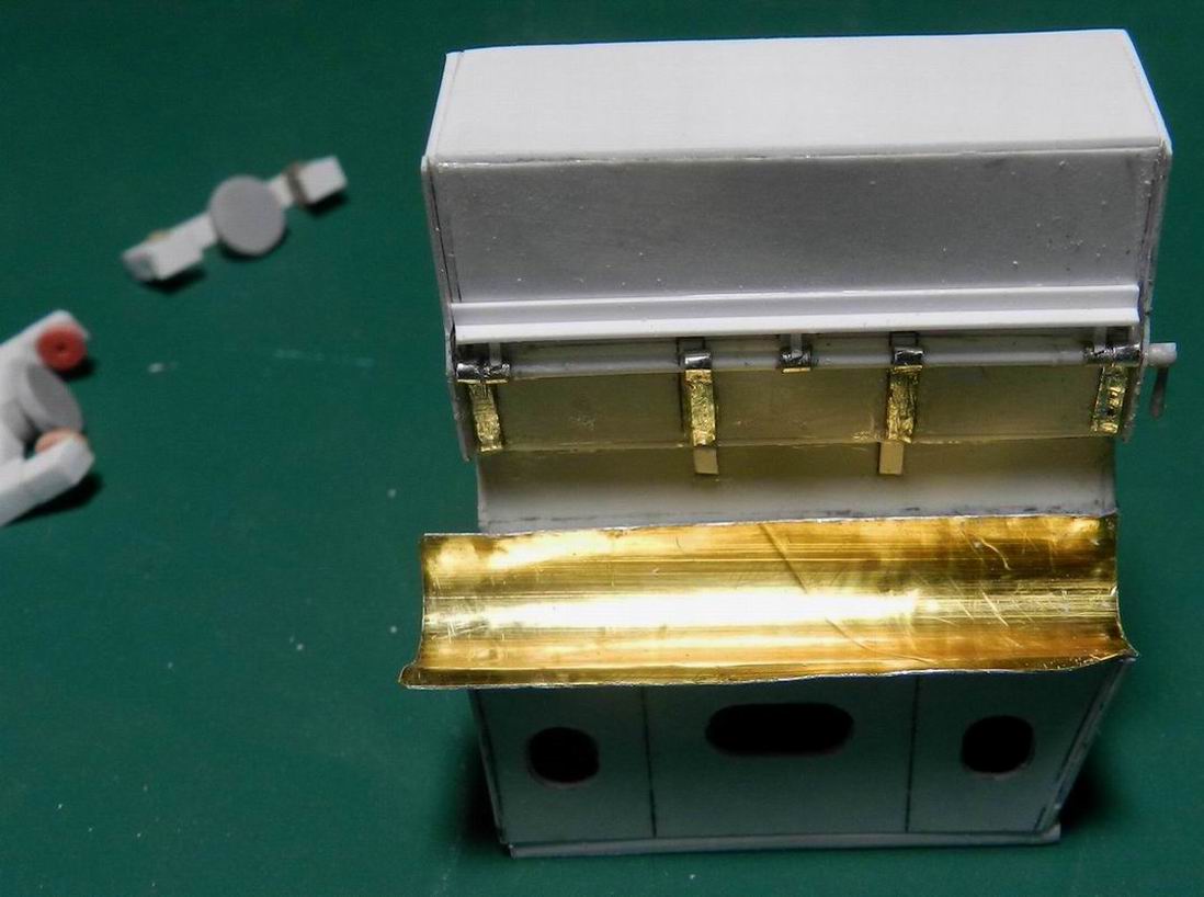 Далее собственно подъёмный механизм. С его помощъю полузаряды и снаряд поднимаются к механизму заряжания. Для начала сделал катки с кронштейнами для прокатывания подъёмника по ростре. Сам подъёмник собранн из полистирола и фольги. В нём размещаются два полузаряда и снаряд.Ростра с подъёмником будет крепися к левой станине. На задней стенке подъёмника приклеил кронштены с катками и блок для троса подъёмника.