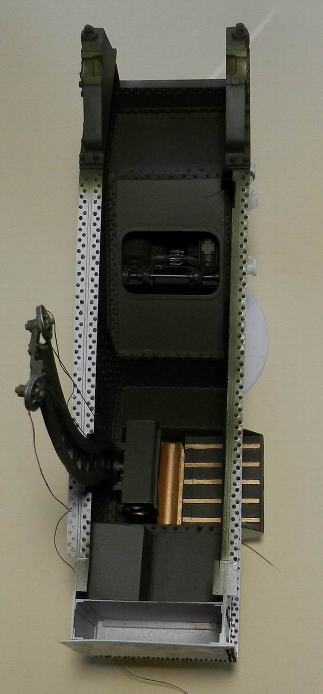 Продолжаю ковыряться с деталями размещёнными между станинами. К левой станине и задней поперечной связи крепится короб с лотком для подачи полузарядов. Практически по центру, снизу установлен короб с напраляющей для подачи снарядов с тележек снаружи. По этой плоскости снаряд скатывается в лоток подъёмного механизма.