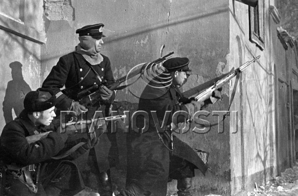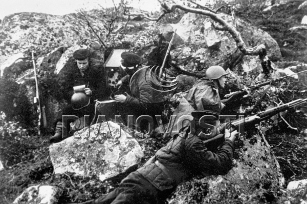 Мое мнение, что это сводный десантный отряд моряков сформированный для выполнения какой-то одной цели, например, захват острова. Формировался из л\с кораблей, вроде я видел подписи, что это Ладожская флотилия, но точно не помню, а найти сейчас не могу. Т.е. отряд отработал и расформировался. Такая практика имело место быть. Именно поэтому бойцы одеты в рабочие платья. Например, при проведении Новороссийской десантной операции, флот выдал в десант л\с с кораблей на пополнение бригад и отрядов МП. Хроники с тех дней много: среди солдат с "распахнутыми воротами" и черными ремнями полно бойцов в белых робах и бесках. После завершения операции, личный состав, оставшийся в живых, возвратился в свои части. В воспоминаниях одного ветерана ЧФ было, что он три раза списывался в МП и затем возвращался на корабль. Я думаю, что это именно такой случай.