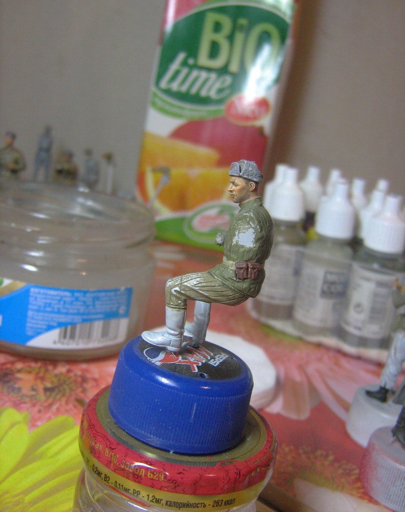 Как говорится ,сообразим на троих,третьим будешь?.Вот и появился "третий".Покрасил ему "хариус".В правой руке планируется кружка,а левая будет лежать на левом колене.