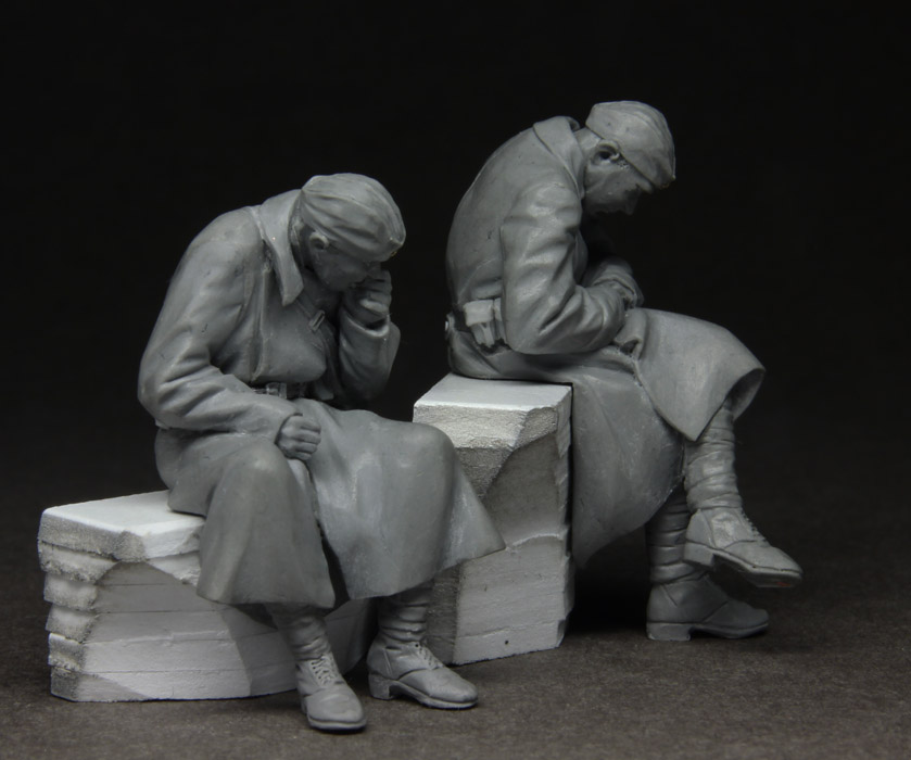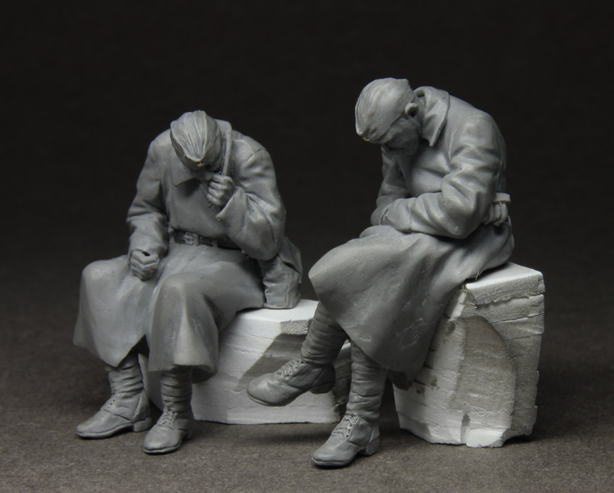 Пропустив очередное обновление блога (ради небольшого сюрприза на День Победы), покажу только что законченные фигурки пары наших минометчиков, которые дремлют под мелким сентябрьским дождичком в ожидании тягачей. Делал фигурки по фото, чем то зацепила меня суровая и простая реалистичность этой фотографии, поэтому и фигурки вышли и по стилистике и по содержанию относительно простыми, но, одновременно, и не такими "простыми" (для меня, по крайней мере). В будущем обязательно сделаю виньетку.