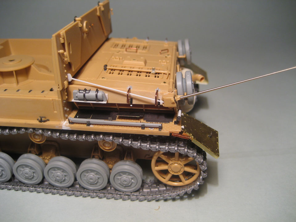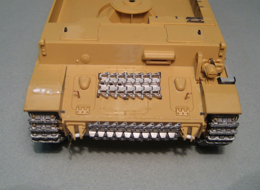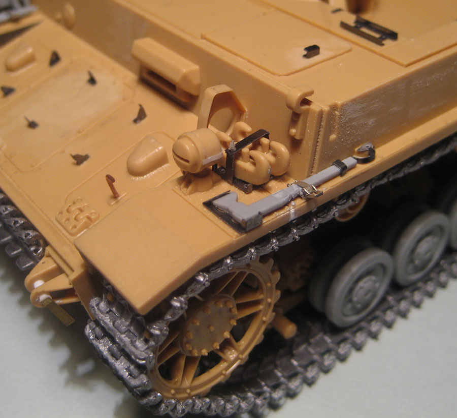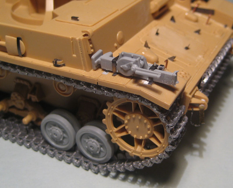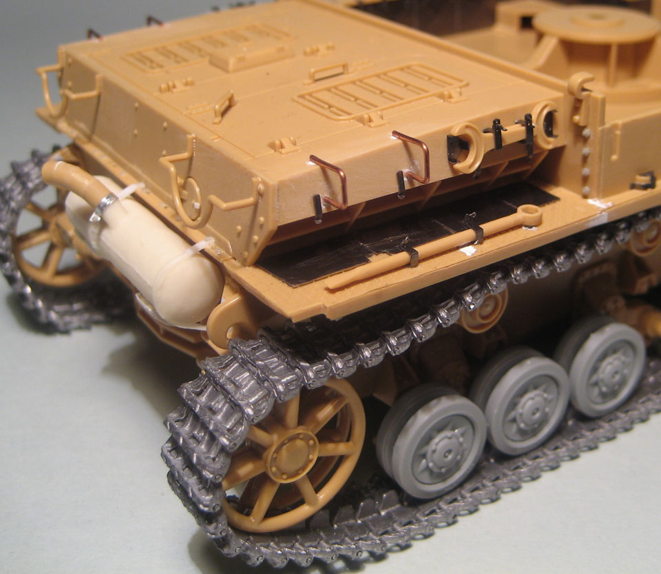 Здорово получается! Очень интересная идея с надгусеничными полками. Раз будешь ставить шикарные траки, может стоило тележки заменить на рабочие Тристаровские, они как раз под Тамию заточены.