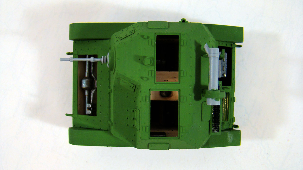 на ряду с гусями приклеил и верхнюю часть корпуса, так как она изначально шла кривая то я не удивился что и при склейке ее с корпусом у меня возникнут проблемы. В основном пострадала задняя часть,в которую пришлось вклеивать полоску пластика так как из за кривизны там получалась большая щель. Обильно все зашпаклевав я так же добавил самодельные буксировочные крючки .