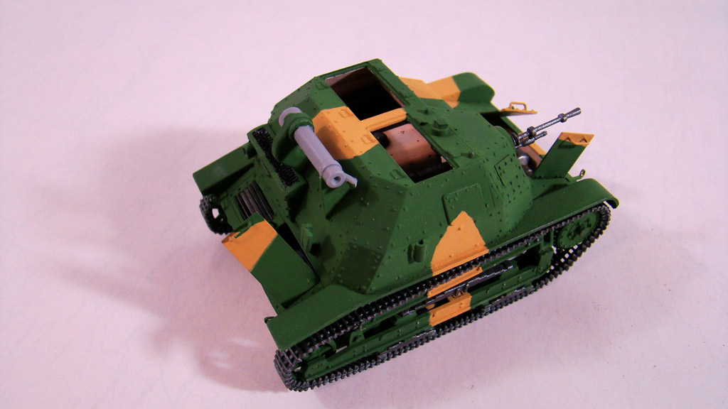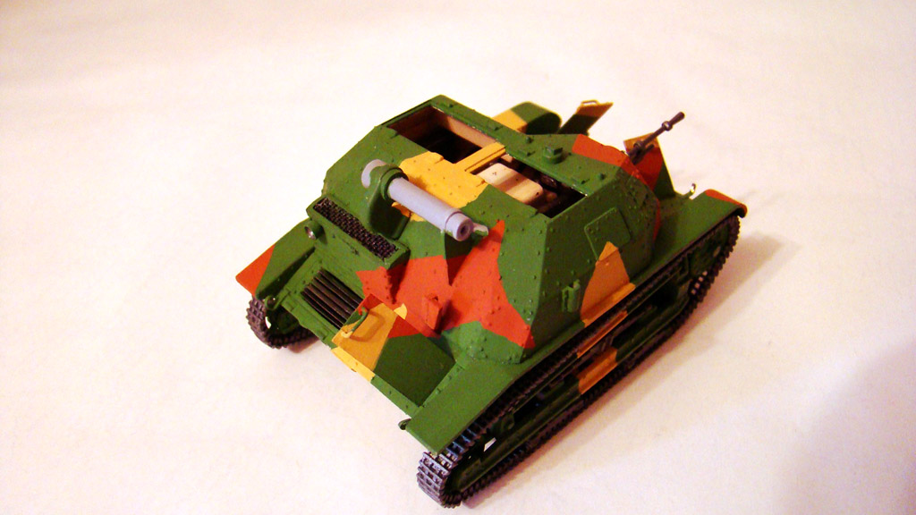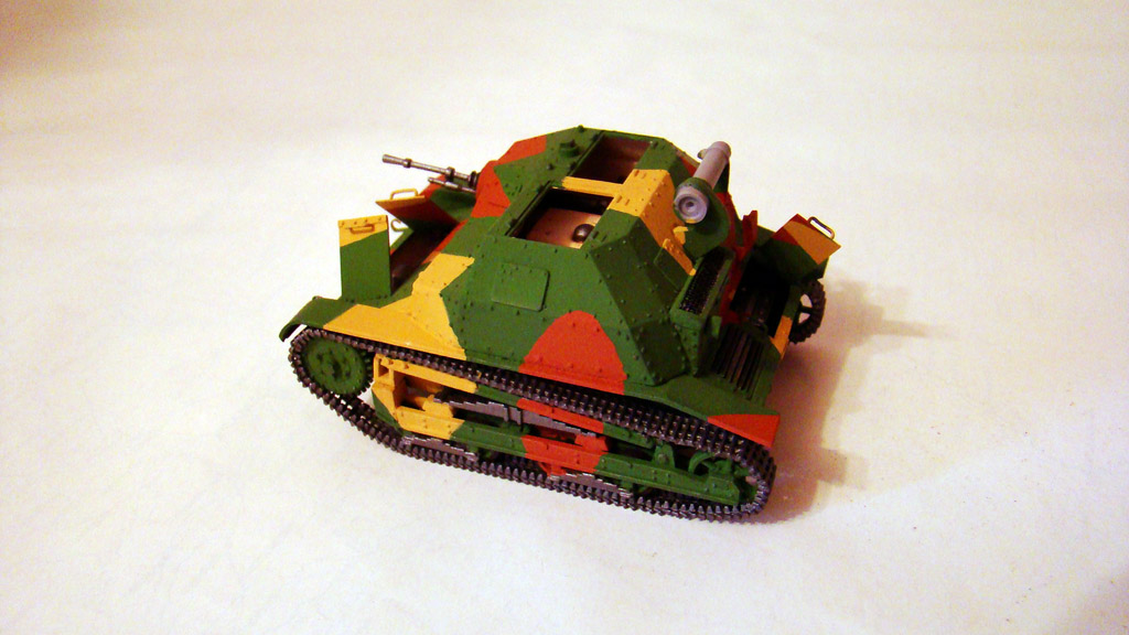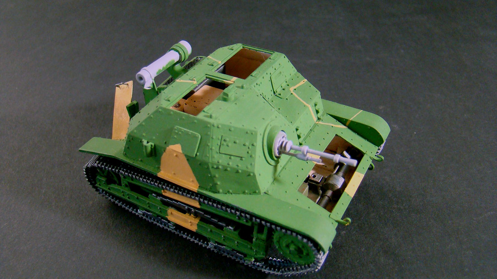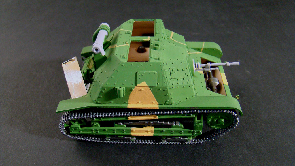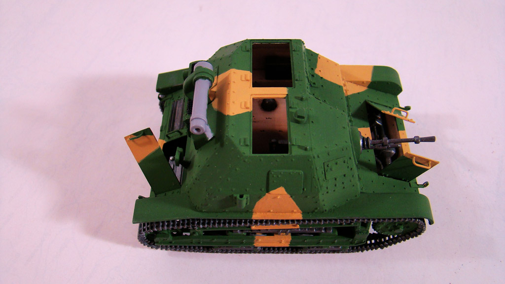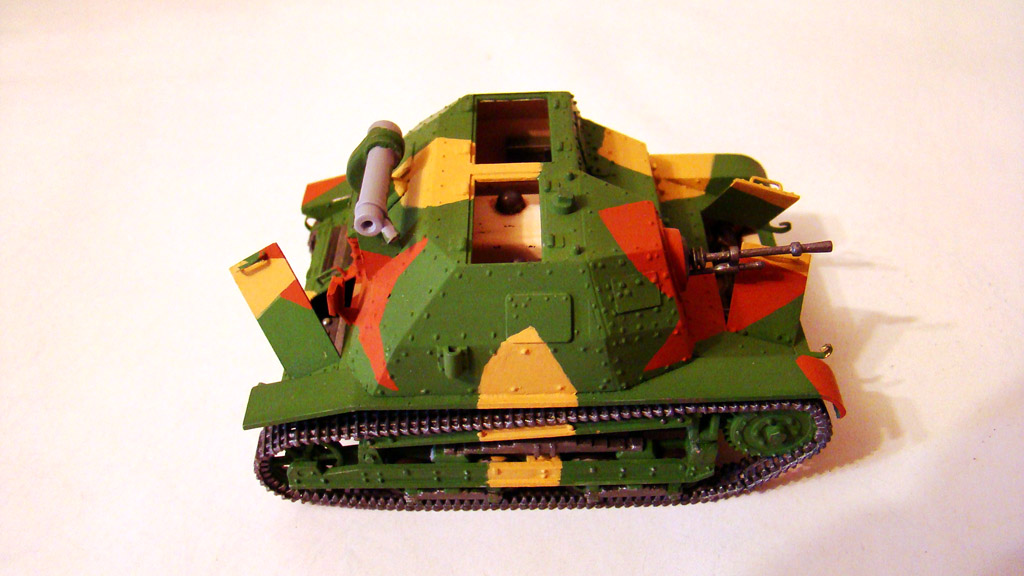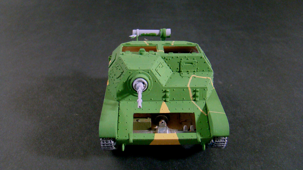 Камуфляж я всегда крашу от руки без каких либо масок и тп..главный вопрос стоит в том какой цвет выбрать основной . .В этой модели я взял за основу зеленый так как он мне показался доминирующим суд по фотографиям да и отдельно зеленые экземпляры встречались.После выбираю структуру пятен,ломаные,зигзагообразные и так далее.Дальше есть два варианта или распечатать на принтере во всех ракурсах фотографии данной модели ,условно расскрасить ее ручкой или карандашем, а потом срисовывать уже на саму модель.Честно говоря этим методом я пользуюсь редко, а в основном просто заранее в голове продумываю фигуры и выкрашиваю.Но при работе краской Валеджо надо действовать быстро так как сохнет она практически на лету,а попросту расходовать такую краску преступление.Первыми я выкрашивал светло-желтые пятна, цвет краски YELLOW OCHRE- номер по каталогу 70913.Фото в процессе нанесения.