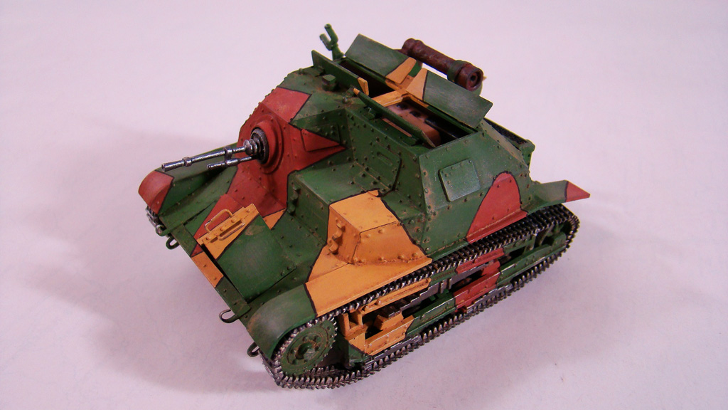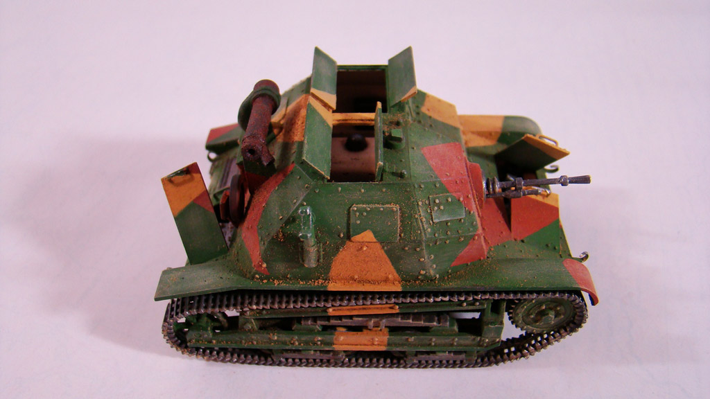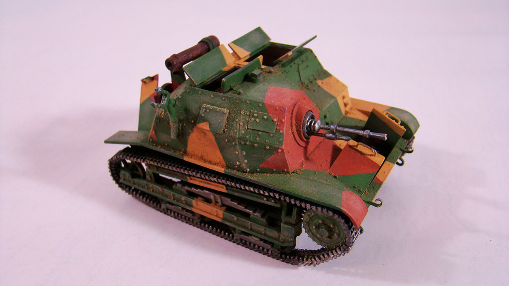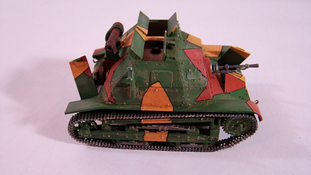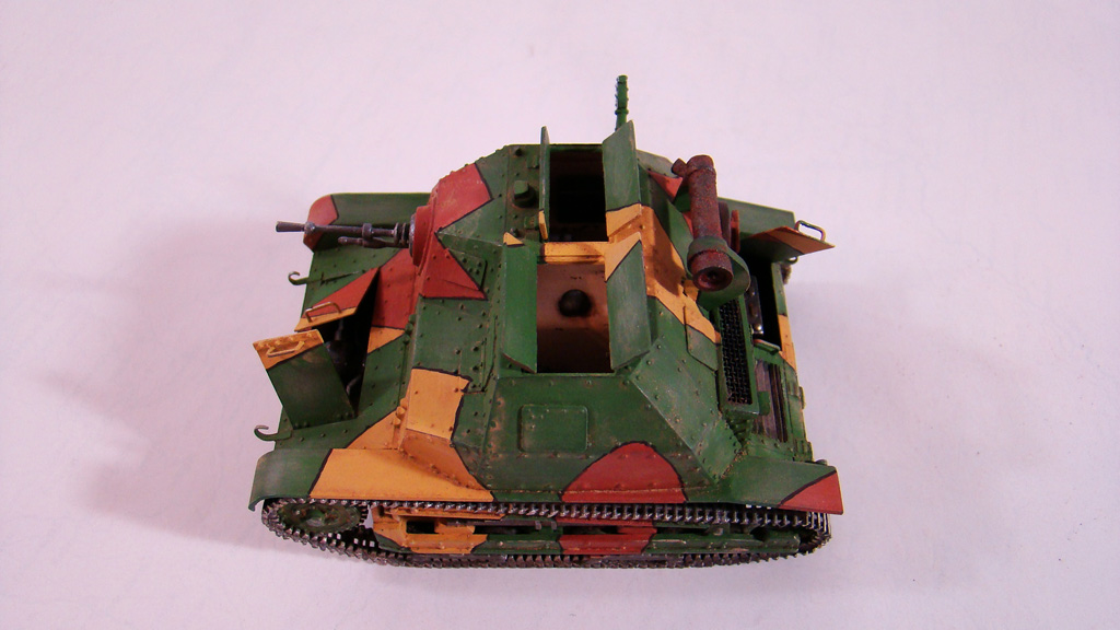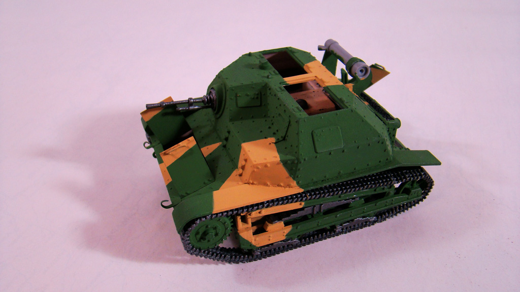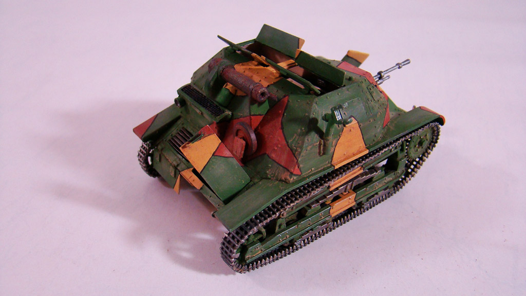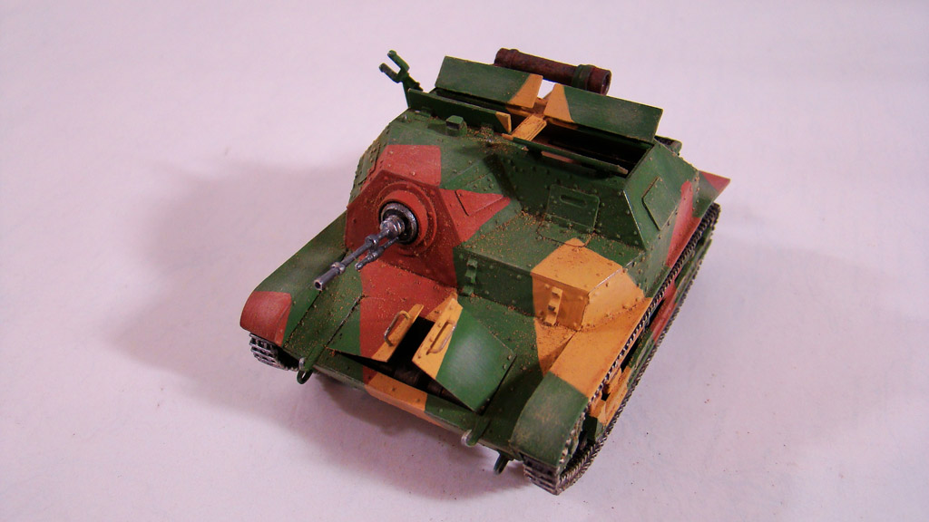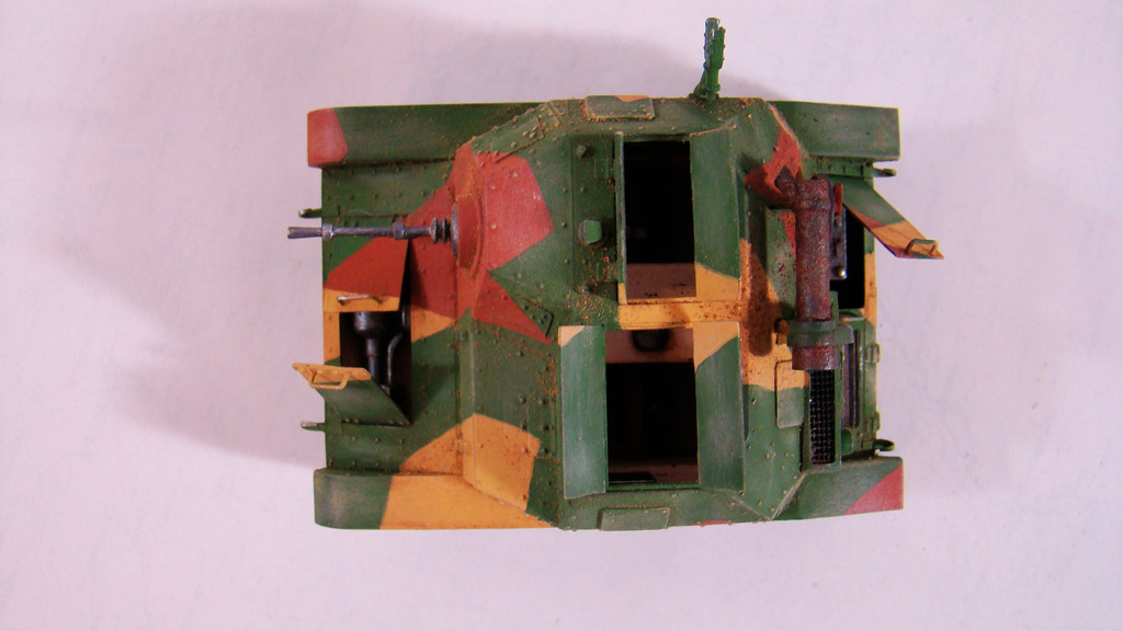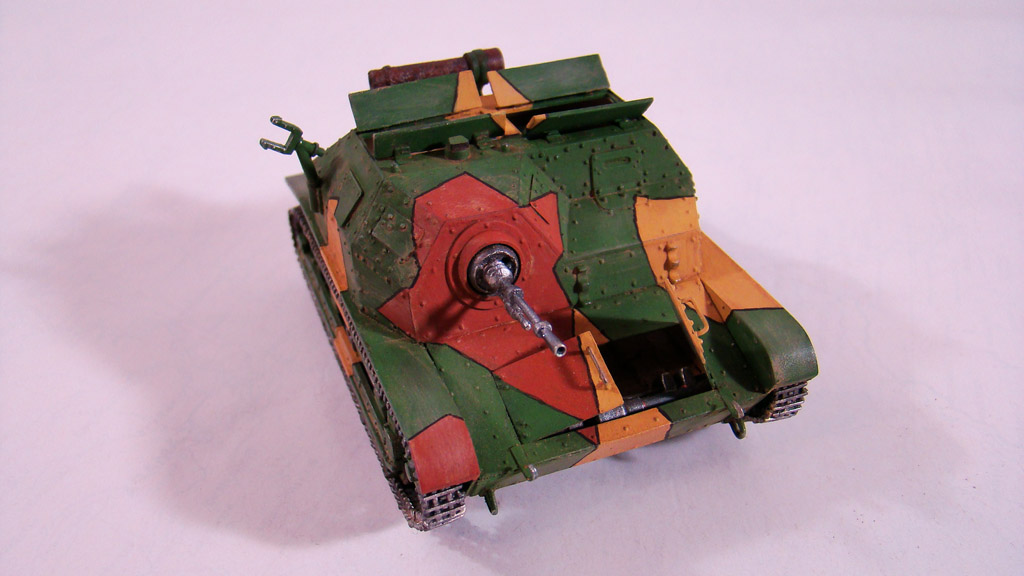 Сначала я сделал легкую смывку коричневым цветом.Дальше вся модель была "агресивно" затерта желто-песочным цветом Тамиевской пудреницы.Затерка производилась и кистью и спонжем.Плюс первый проход карандашом по граням.Вдобавок покрасил глушитель,есть у меня старый бутыль нитро краски цвета ржавчины которому уже лет 5 ,так вот он киселеобразного состояния очень мне нравится для такого жирно-вздутого эффекта железа от ржавчины.