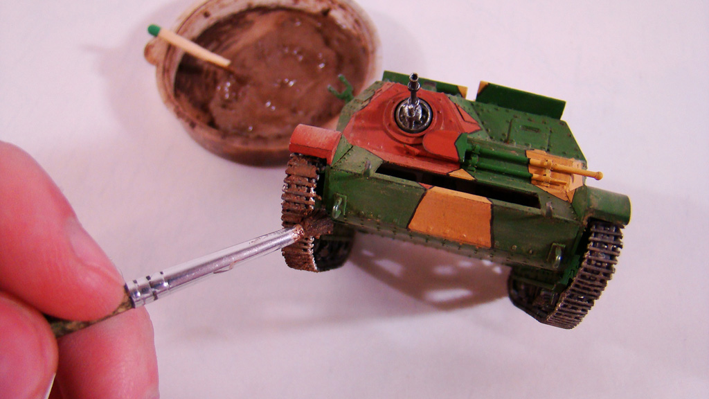 Наносим на траки, нижнюю часть ходовой и брюхо . На траках в основном я замазываю углубления ,а излишки тут же убираю рукой.Кисть лучше брать ненужную или старую так как после таких процессов для нормальной покраски она будет не пригодна.