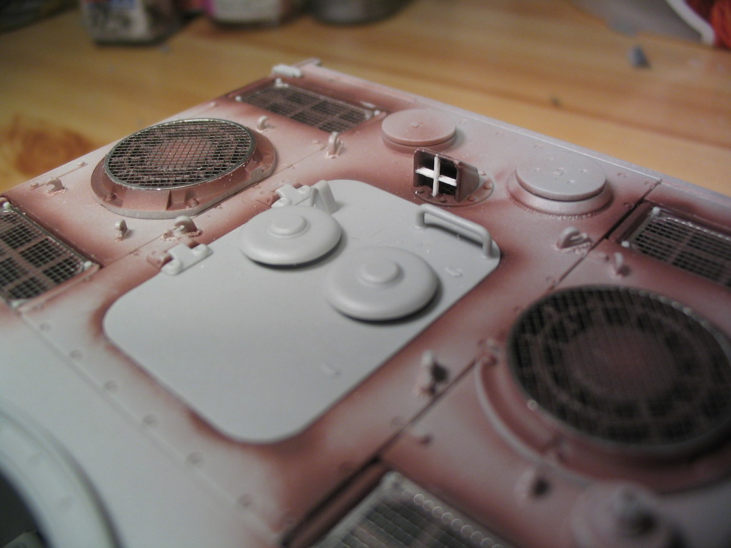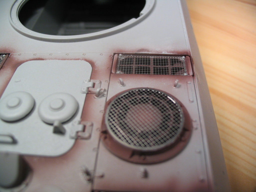 Сделал ограждение в колпаке воздухозабора. На этот раз попробовал сделать правильно, вместо тянутого литника использовал 0,1мм листовой пластик, поскольку на реальном танке крестик собирался из плоских пластин, а не круглых стержней.