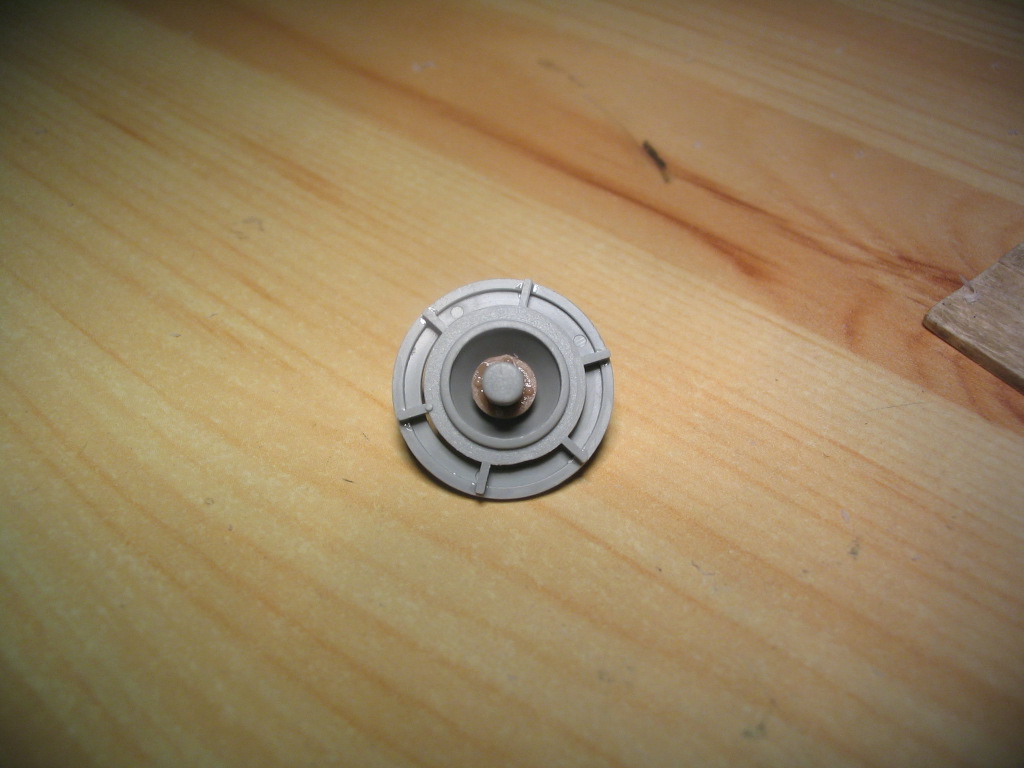 На модель буду устанавливать моделкастеновскую гусеницу, она великолепно ложится вокруг звёздочки, и между опорных катков, единственное ленивец слишком широкий и не влазиит между зубaми трака, правда проблема всего в долях миллиметра. Я сточил все три диска ленивца понимногу (два наружных и один внутренний), а также добавил недостающий болтик.