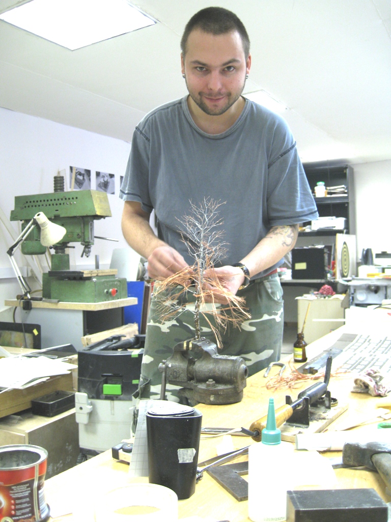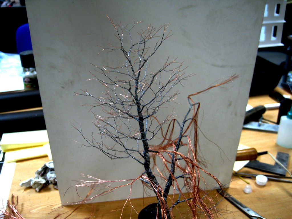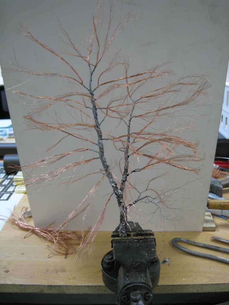 tankist, все очень просто. медные многожильные провода очищаются от оплетки, нарезаются длиной в зависимости от высоты задуманного деревца. + 50-100мм. (запас на ветвистость и изгибы) скручивается все и оппаевается, удобнее начинать с корня, точнее с той части которая будет втыкаться в почву (подмакетник) далее зажимаете этот пучок в тиски и понеслось! а проводочки лучше брать как можно тоньше! тогда более изящные веточки получаются.