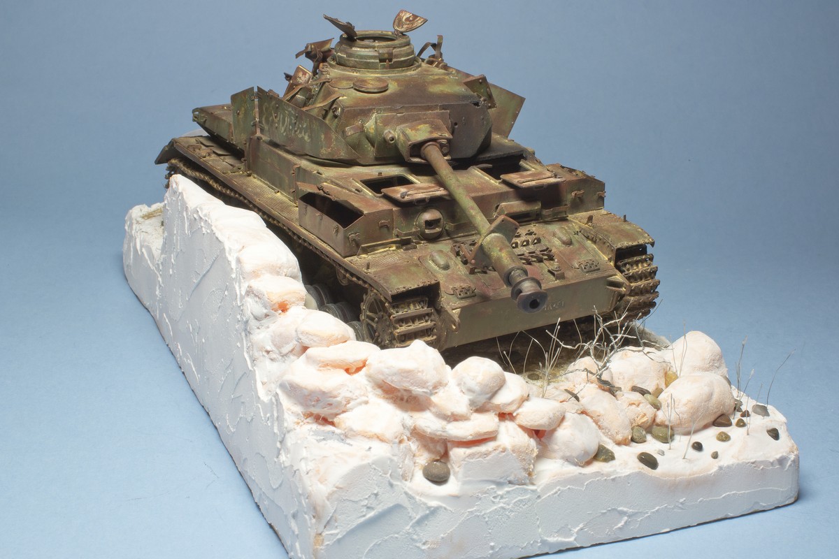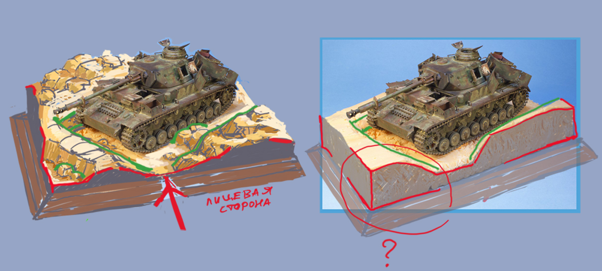 Доброй ночи,Андрей! Молодец, что начал делать основание. С интересом буду следить за продолжением работы. Пока работа с основанием не зашла слишком далеко, попробую дать пару советов. Во-первых, нужно определиться с лицевой стороной диорамы - это та точка, с которой танк смотрится интереснее всего и с этой стороны будет название работы. Соответственно и основание под раму нужно обрезать так, чтобы углы не смотрели на зрителя(я так понимаю рама будет не круглая, а прямоугольная