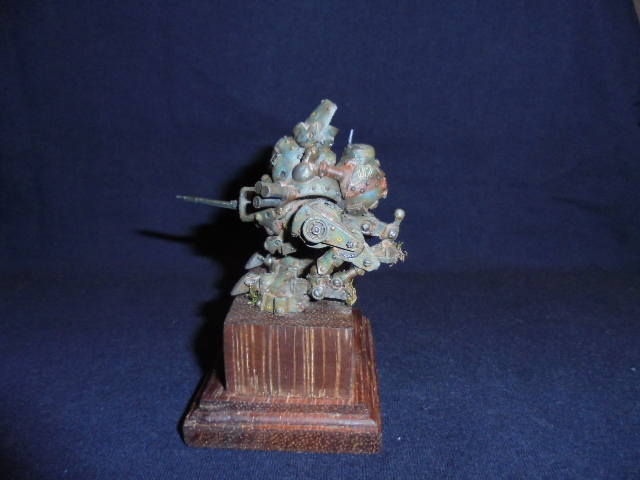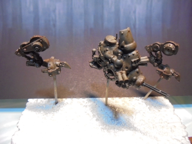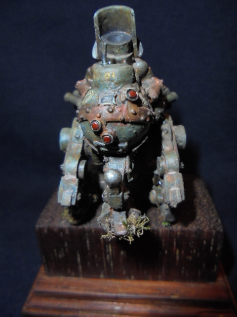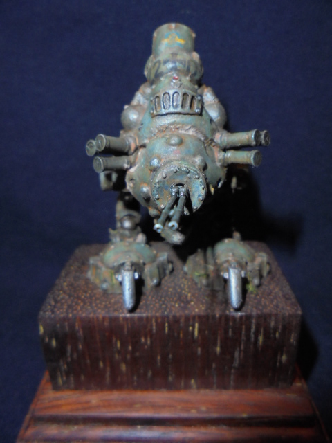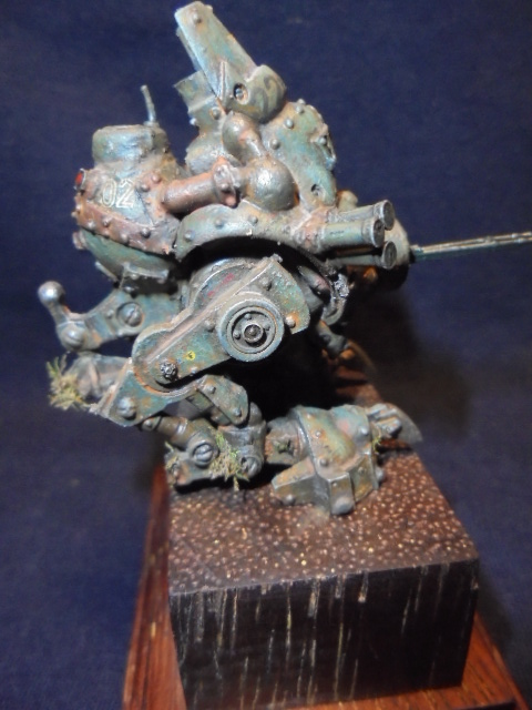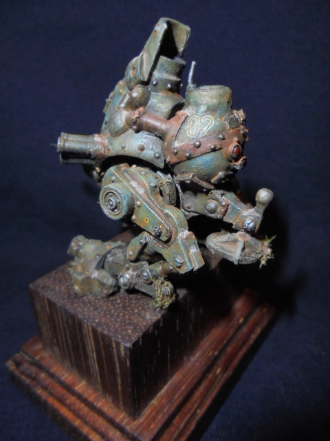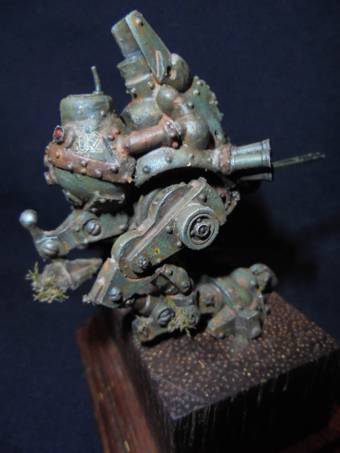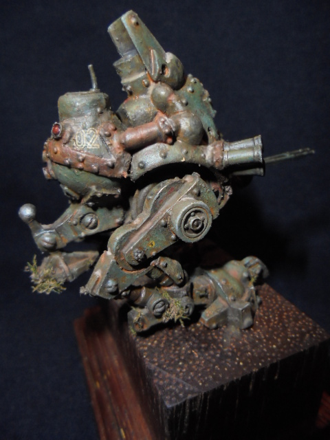 Теперь непосредственно о работе.За основу была взята миниатюра из игрового мира" Warmachine" клана"Наемники".Размер миниатюры 40мм,белый металл.До покраски я решил ее оживить различными деталями из других наборов.Изначально мастерил открытую кабину с панелью приборов,разбитыми стеклами,кучей проводов.Но не вписался в масштаб,а,главное,размеры виньетки,поэтому пошел по легкому пути.На мет.пулеметах и пушке сэкономил,жаба задушила,слишком дорогой проект раздулся из дешевого набора.Пусковые установки дымовых гранат-фототравление+еще кое-какие детали.Первые фото коробки и первичной грунтовки.