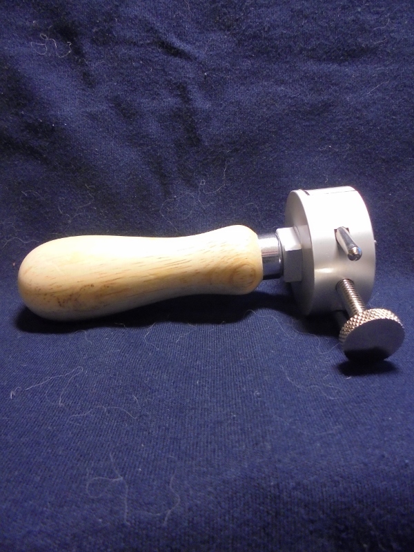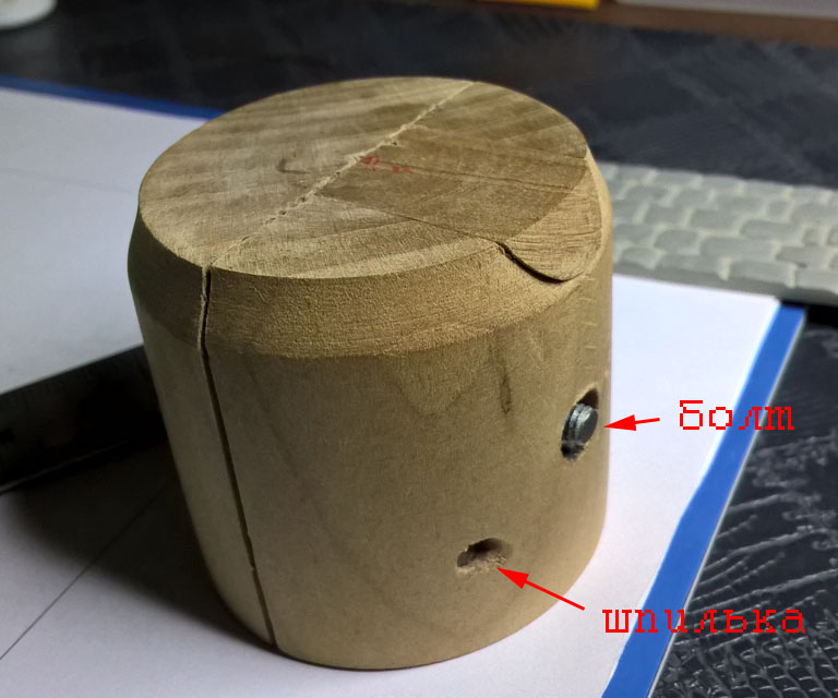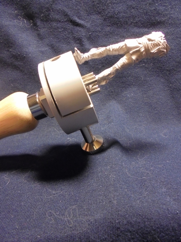 А вот держатель использую самодельный, из цилиндрической деревянной болванки, как для работы с мастер-моделями, так и для крепления готовых фигурок, чтобы красить. Распиленная пополам болванка стягивается болтом с гайкой (все думаю поставить барашковую туда, чтобы не доставать отвертку каждый раз, когда понадобилось снять модель в процессе), а чтобы половинки держателя не крутились вокруг оси стягивающего их болта, в дополнительные отверстия с боков держателя установлены 2 гладкие шпильки (хватило бы и одной, но я сделал две, просто для симметрии).