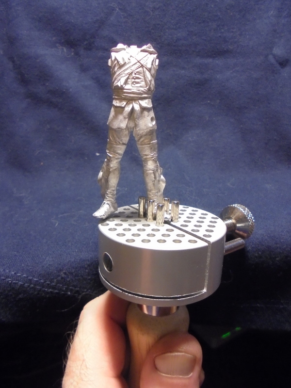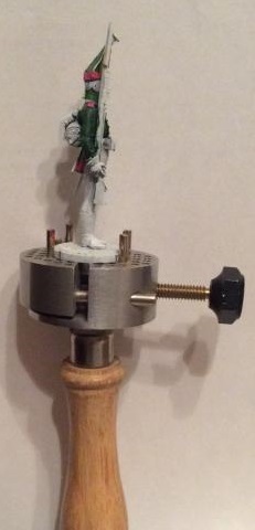 Спасибо за коментарий.Я забыл написать,что пробовал фигурку"Кастингс" с родной подставкой-у меня не получилось,миниатюра тяжелая,шпульки зачем-то полированные,поэтому жестко не закрепил.Использовал"из коробки"четыре штыря.Я думаю,в будущем,делать небольшие пропилы в подставке.Про штыри в фигуре я тоже думал,но здесь надо подбирать диаметр соответственно отверстиям,чтобы плотно входили и вклеивать в фигуру"намертво",чтобы при сдвигании тисков они не сдвинулись.Так что моделька для дальнейшего"творчества".Я бы сам,если было бы время,сделал бы свою из подходящей деревянной ручки со всеми наработками и ньюансами.svt Wrote:Просто она рассчитана, на то, что красят фигуры зажимая штифты, торчащие из ног, либо непосредственно зажимают в держалке родную подставку фигурки (типа того, как это на фото ниже).