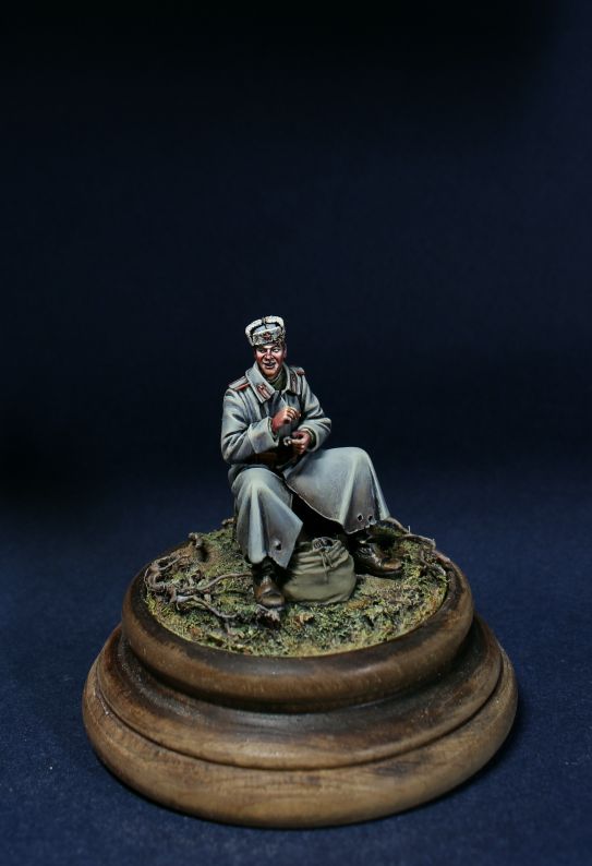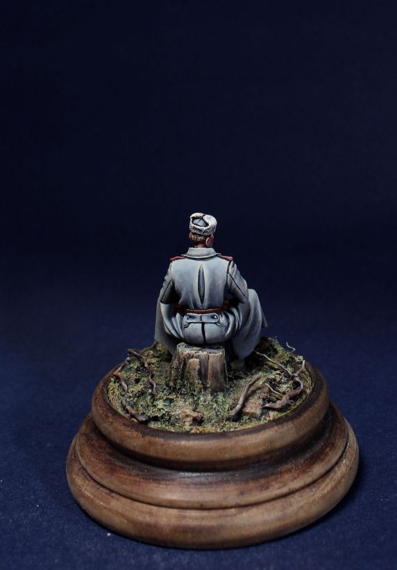 Красиво. Единственно, о чем уже не раз по "Теркину" говорили - такие круглые дырки на полах просто нечем получить. Ни "колючкой", ни у костра. Шинельная ткань скорее порвется "уголком" расходясь к краю - а раз он у шинели неподшитый, ск-ко помню, то и через край. А на фигурке можно было бы прорезать дырки до подола и намного изменить их форму...