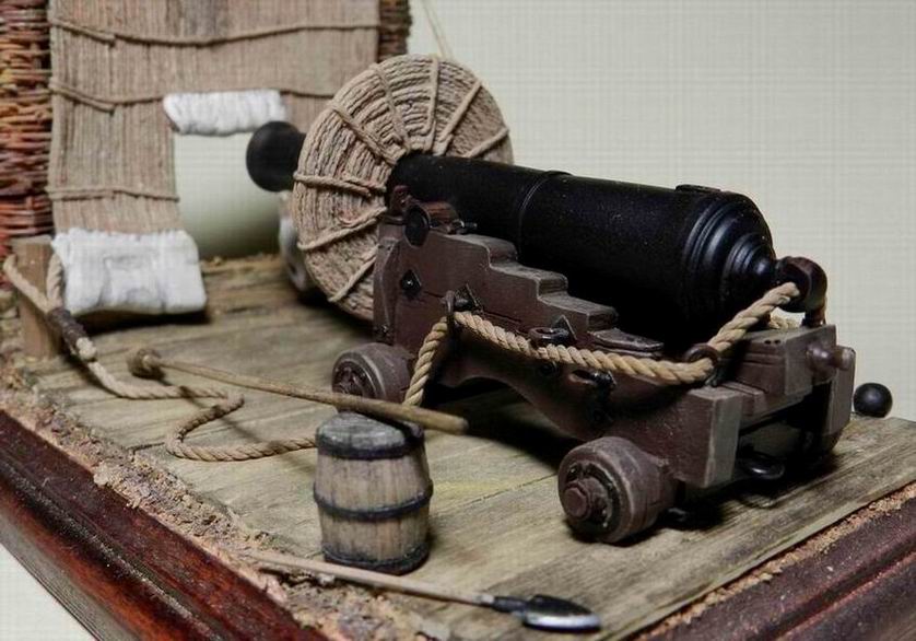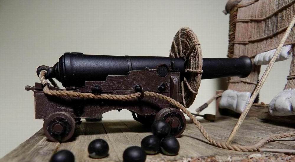 Блоки двухшкивные заметны на фото, и здесь они не помешали бы - катать такую пушечку даже при полном расчете ( 12 человек, а не 5 ) без блоков трудновато. Сомневаюсь насчет формы чеки на цапфенной накладке - на чертежах вроде бы они не Г-образной формы. Но придираться - это не модели качественно строить, да и не мешки таскать...