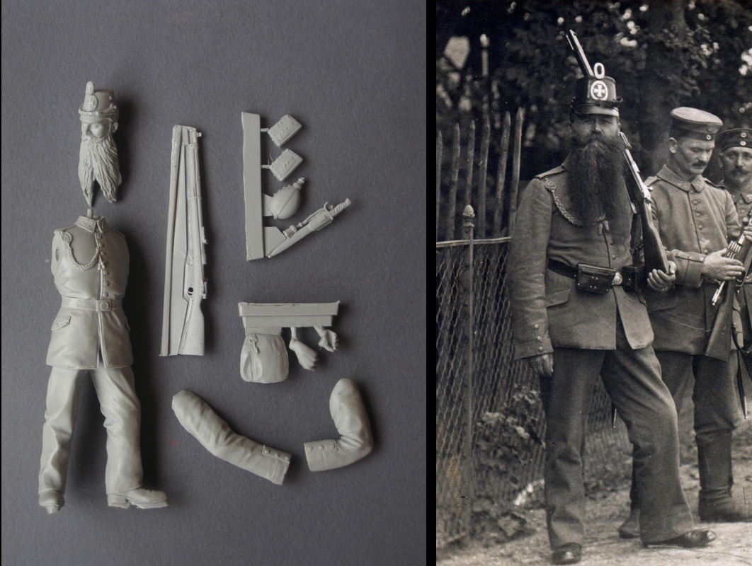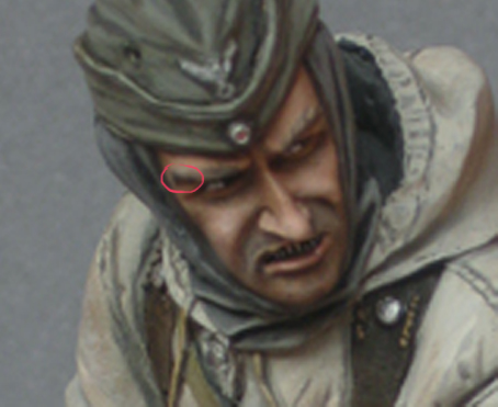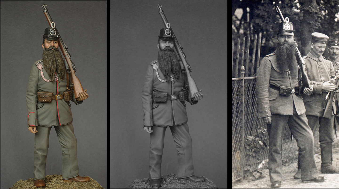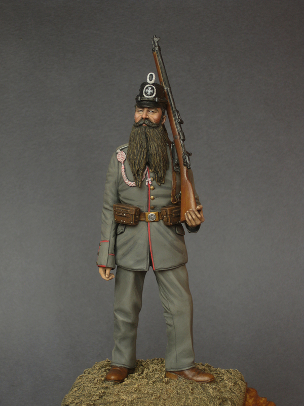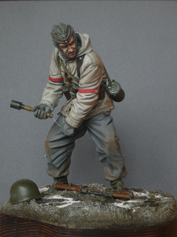 По самОй фигурке у меня сложилось такое впечатление: солдат смотрит как-то "вперёд-вниз" - так, как будто объект, для которого предназначена "колотушка", находится, скажем, в подвале дома, или же сам персонаж диорамы приготовился к гранатометанию как минимум со второго этажа здания.