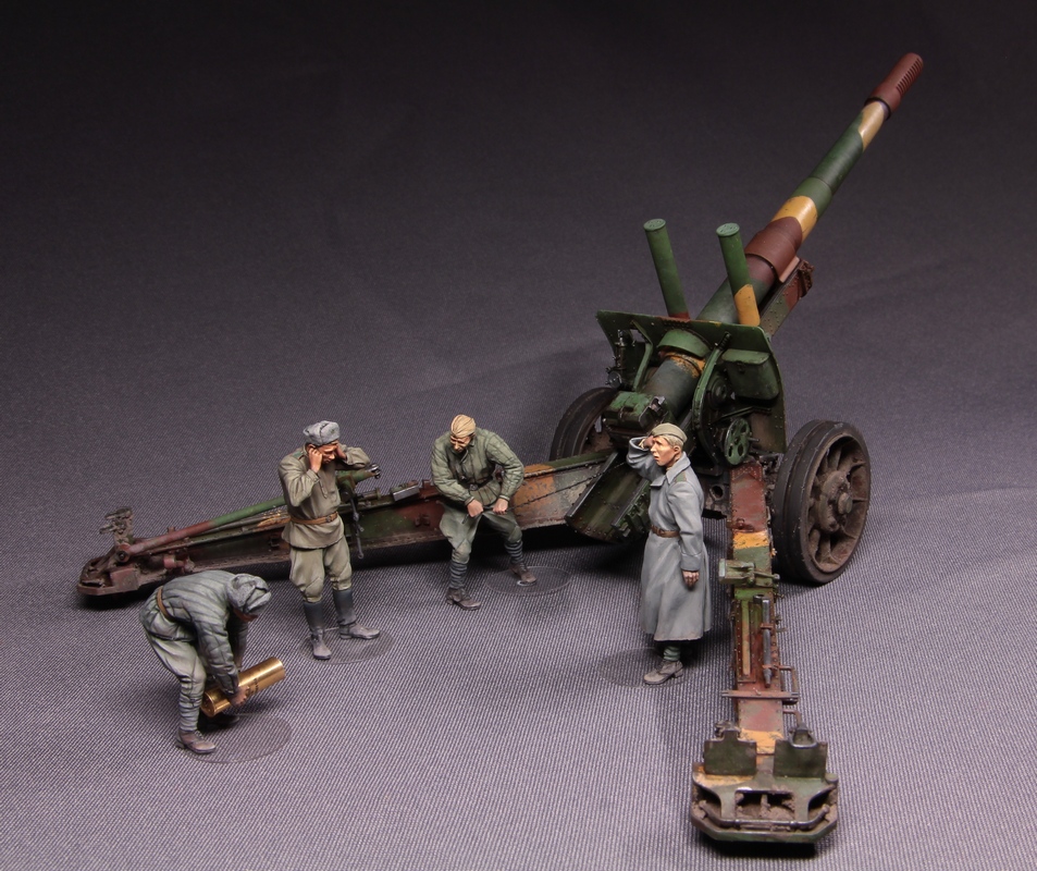Гаубицу особо не фотал, потом уж на готовой диораме в антураже сниму, но выглядит она как-то так. Окраска/везеринг как обычно: грунтовка, база тамиевским акрилом, модуляция, фильтры темперой, сколы акрилом, маппинг, смывка, грязь из пигментов, пыль тамиевским акрилом из аэра, ну и там сталь карандашом и Mr.Metal Color и подтеки масла масляной краской с лаком. Только модные нынче жидкости AK-Interactive не использовал, но тоже надо попробовать, хотя я и сейчас результатом, в принципе, доволен. Тут "изюминка", как мне кажется, должна быть не в новейших технологиях, а в балансе применения всех доступных средств, усидчивости и художественно-техническом воображении и наблюдательности. Есть ещё, конечно, над чем работать, но, в принципе, это не так уж сложно. Скульптура (в большей мере) и роспись (менее) фигурок больший хай-тек.