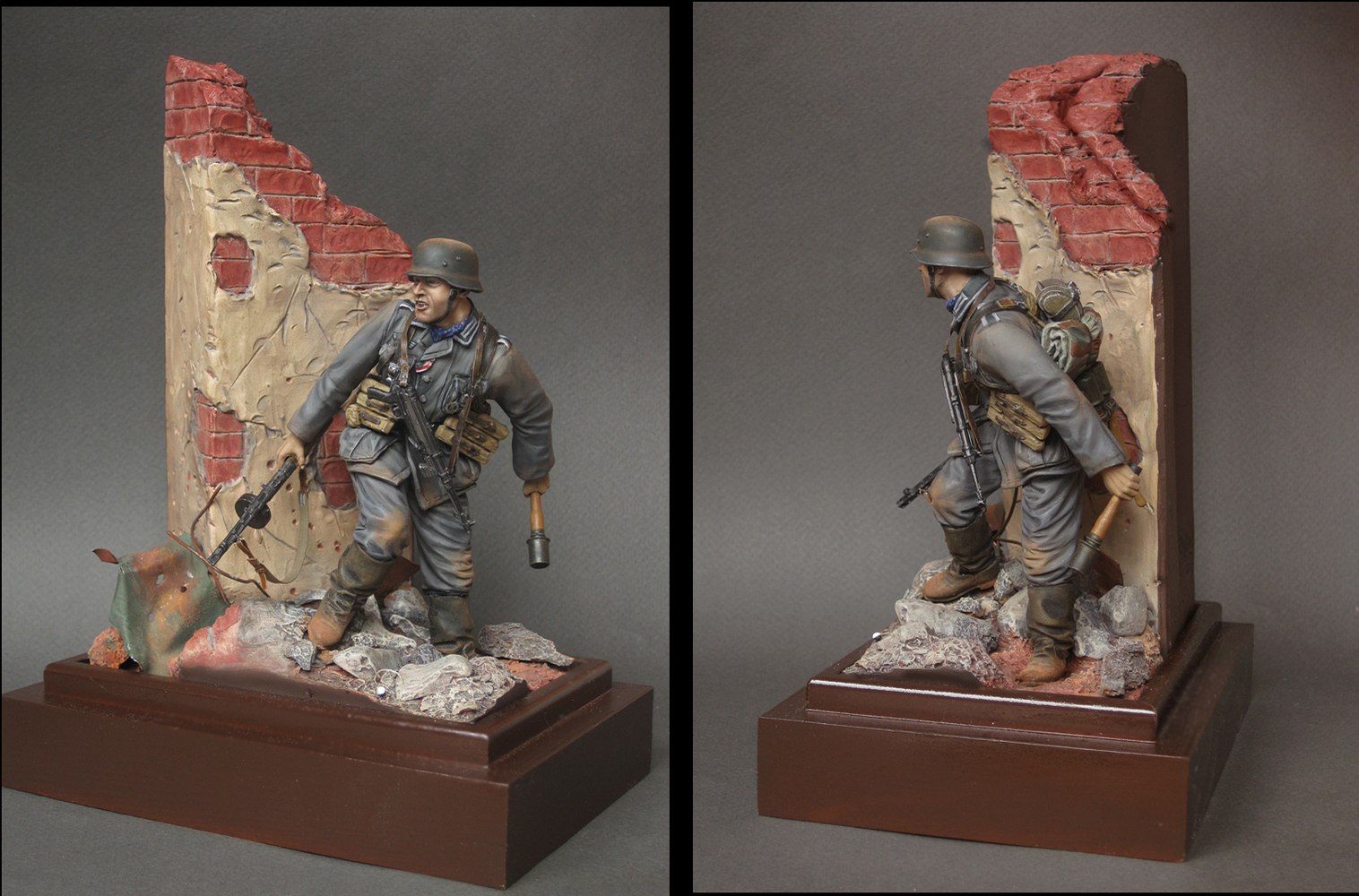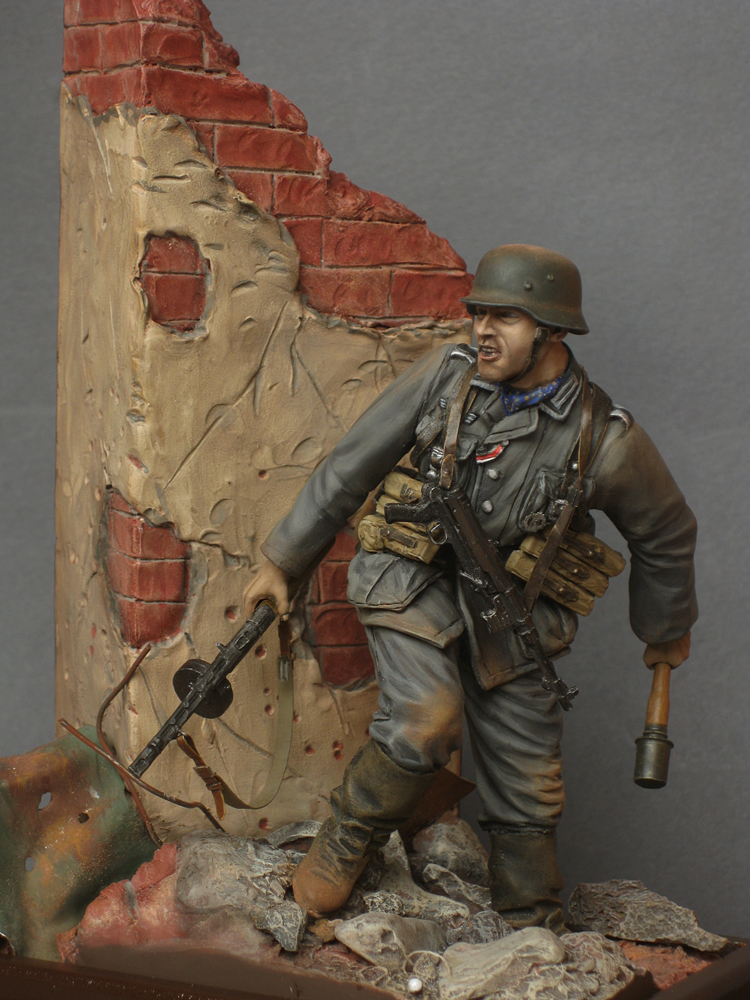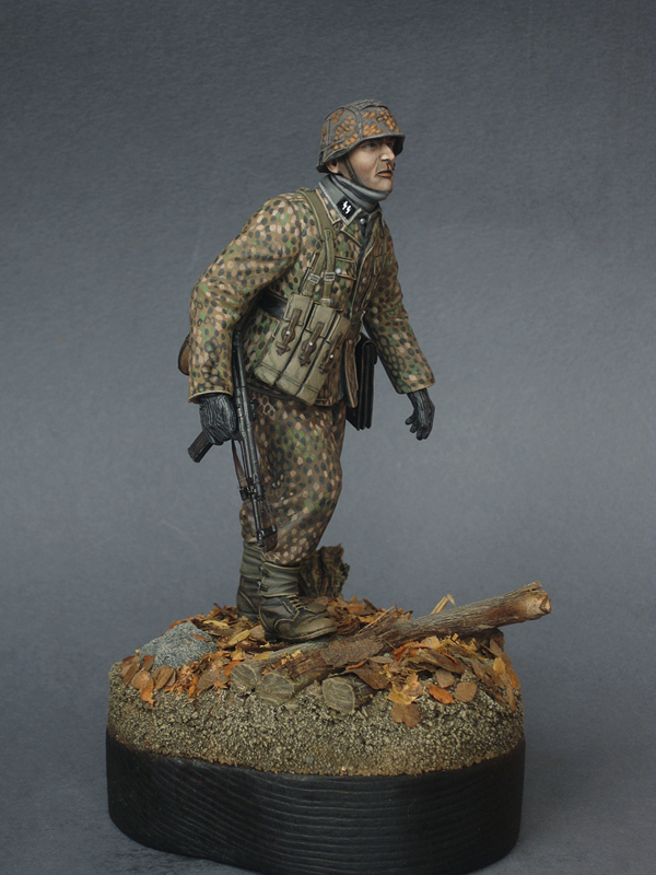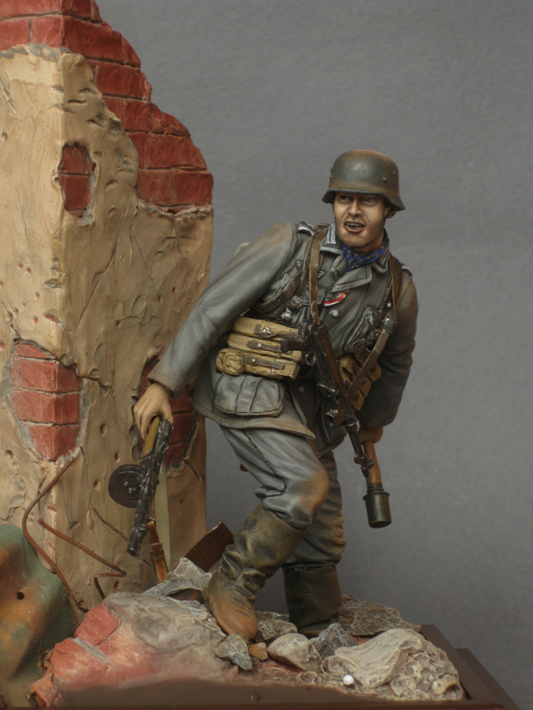 Может, стоило на этапе сборки оторвать резцом подшлемник от подбородка и повесить подсумок децл поболее под углом? На известной фотке, по мотивам которой сделана фигура, немец на ходу правым бедром и штурмаком поддает подсумок кверху и выравнивает. На фигурке этот момент почти не отражен, да и относительно ремня он выглядит низковато. А в остальном. наверное, лучше и не сделать.