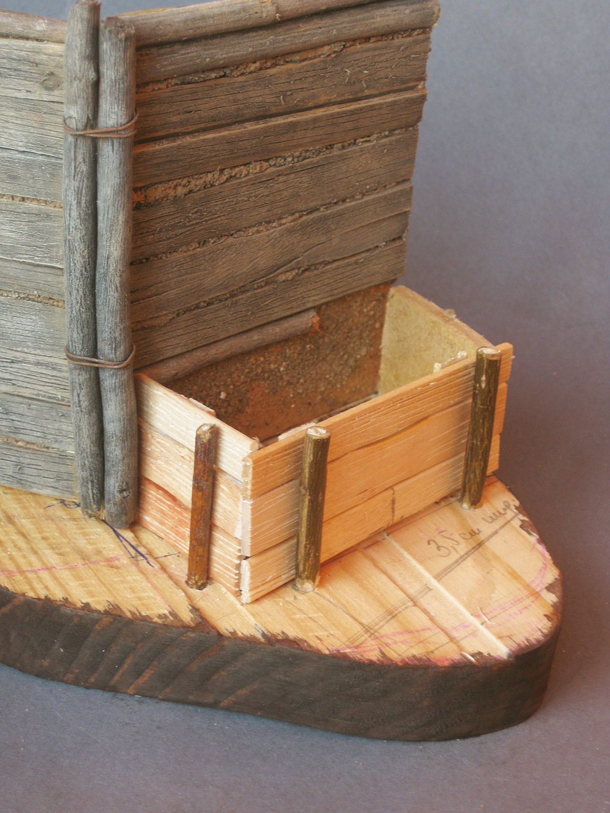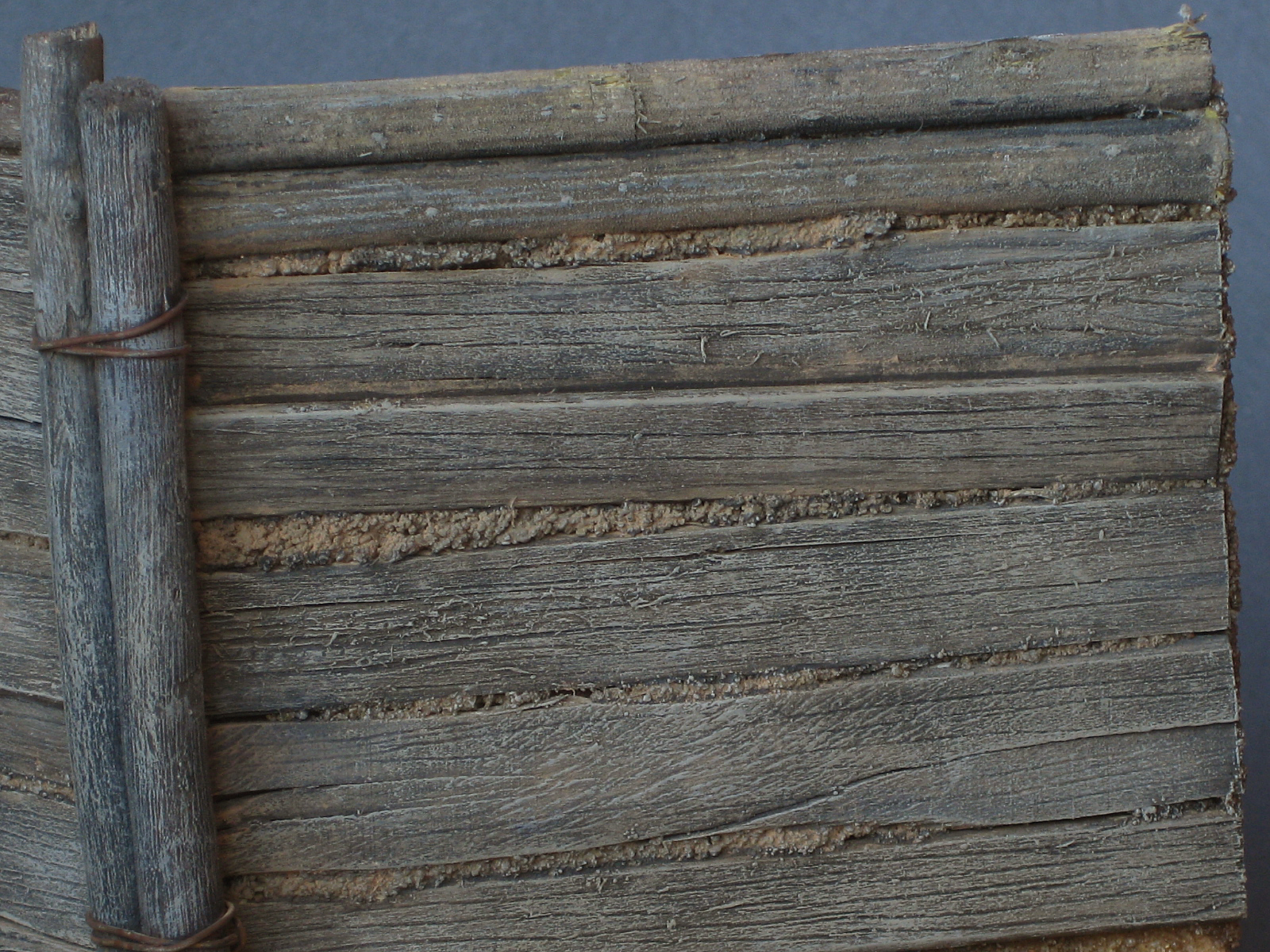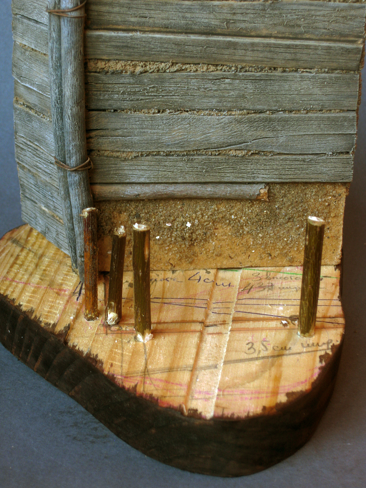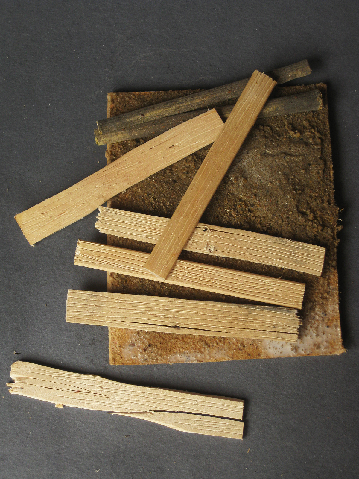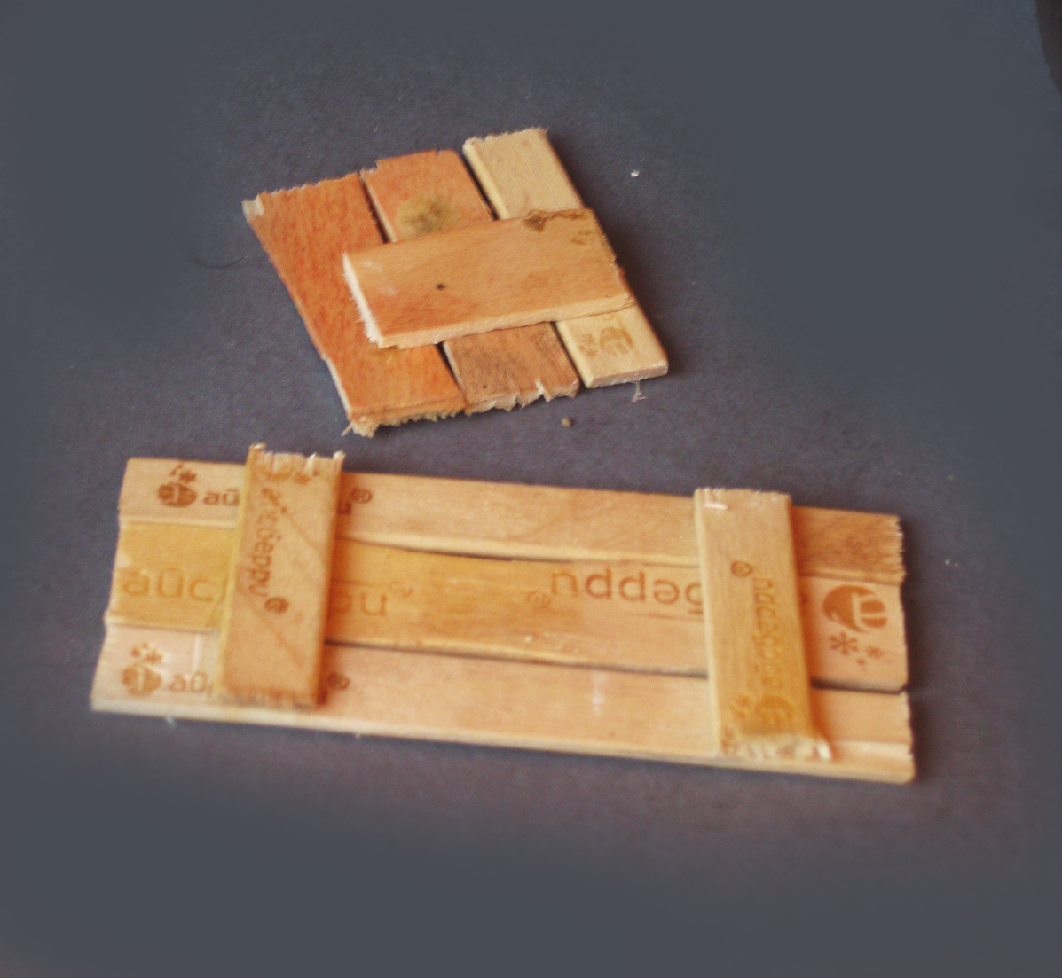 3. из палочек мороженого в размер нарезаются доски, структура дерева процарапывается шилом или ножом, можно поломать немного - это только на зрелищность сработает