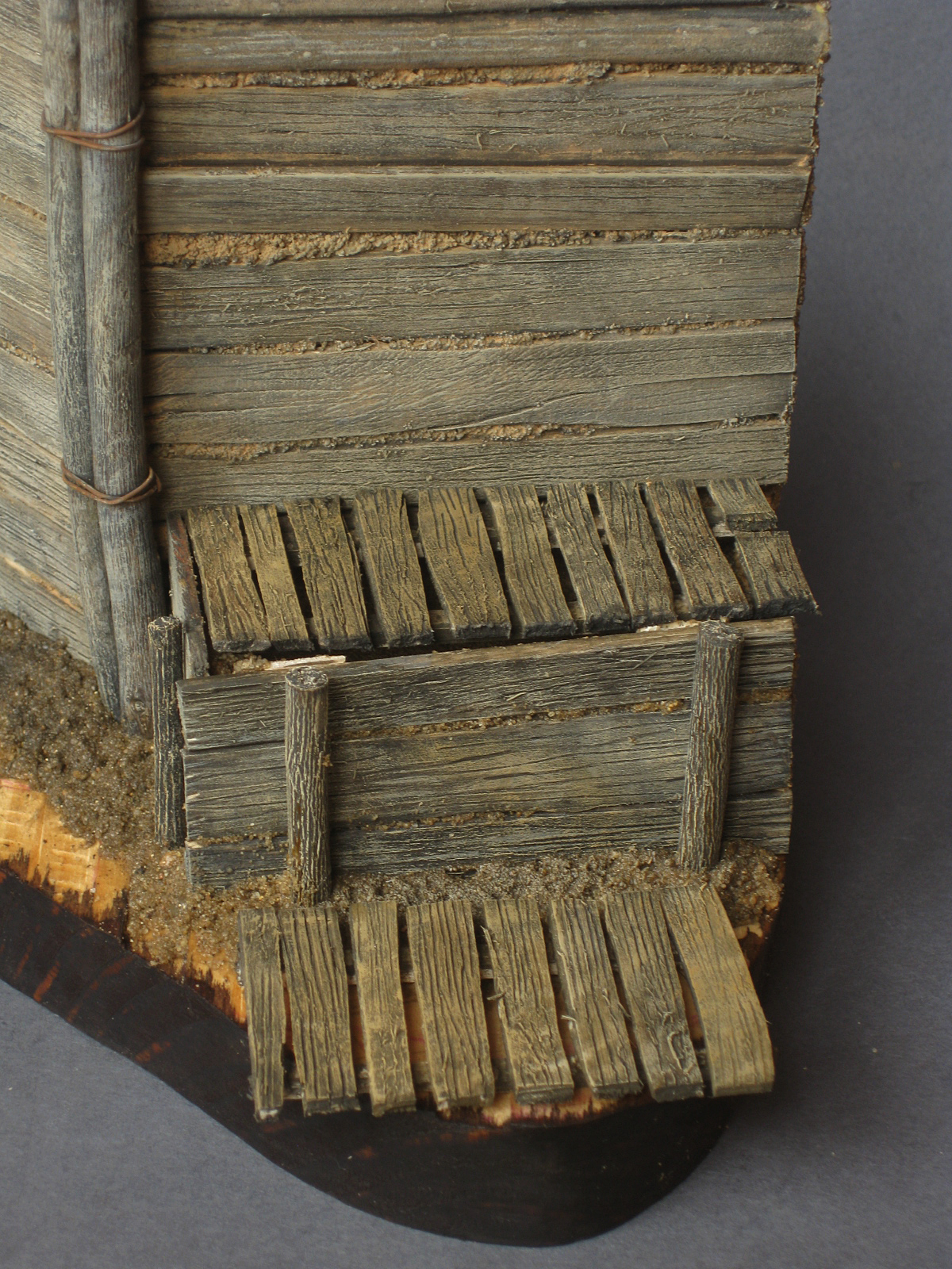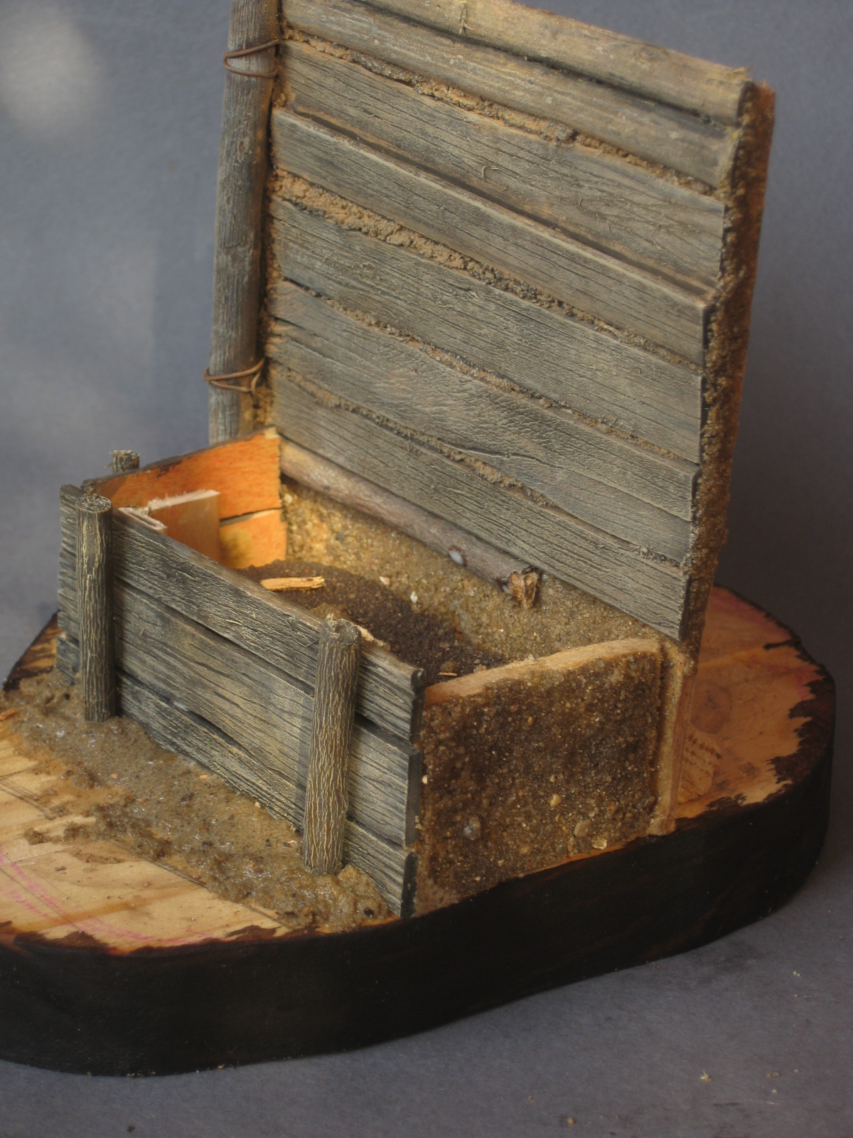 *Нет смысла заливать весь внутренний объём песком - это утяжелит конструкцию, удлинит период высыхания и затвердения. Поэтому заливаем понизу периметр на 2-3 мм - это как дополнительная фиксация будет работать после высыхания. В середину можно положить пенопласт, обрезки деревянного брусочка и т.д - в общем всё что не нужно, оставив сверху примерно 4-5 мм для заливки песком , учитывая, что сверху ещё трапик будем укладывать. Также оставляем небольшие промежутки между стенками - смесь затечёт туда и вылезет из щелей, придав дополнительной достоверности нашей конструкции. Главное - не очень жидко должно быть. Опытным путём достигается.