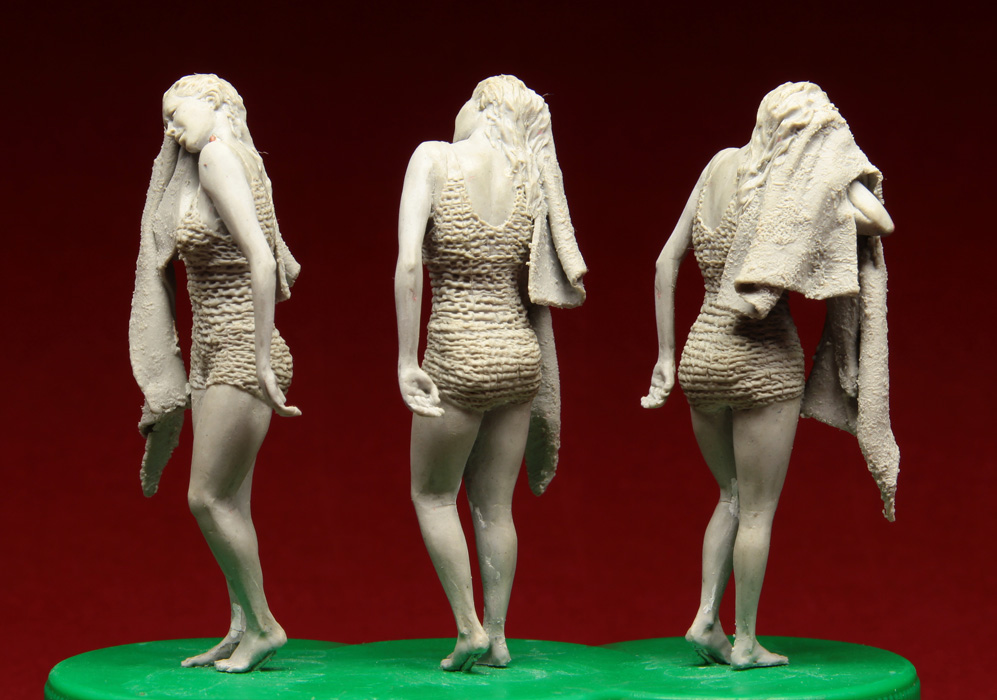 Подождал после замеса просто, на целлофане раскатал, ножиком обрезал, на фигурке по месту из пластики основу под полотенце слепил, ну и сверху этот листик Апокси красиво завернув и наложил, как застыла пластику удалил, а потом мокрым Апокси и очень коротко обрезанной кистью фактуру махрового полотенца придал.