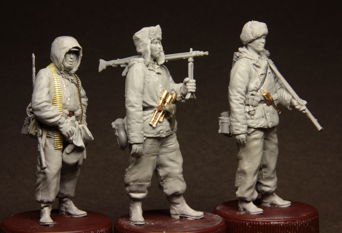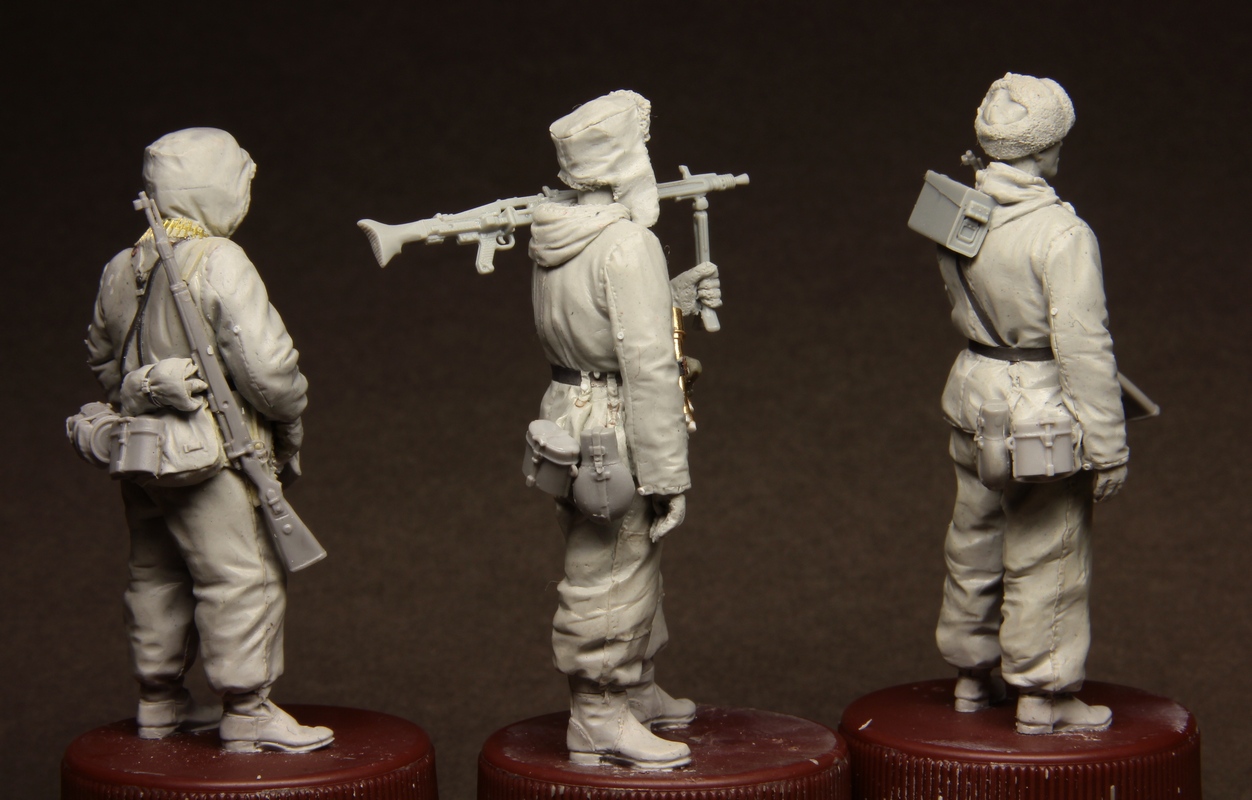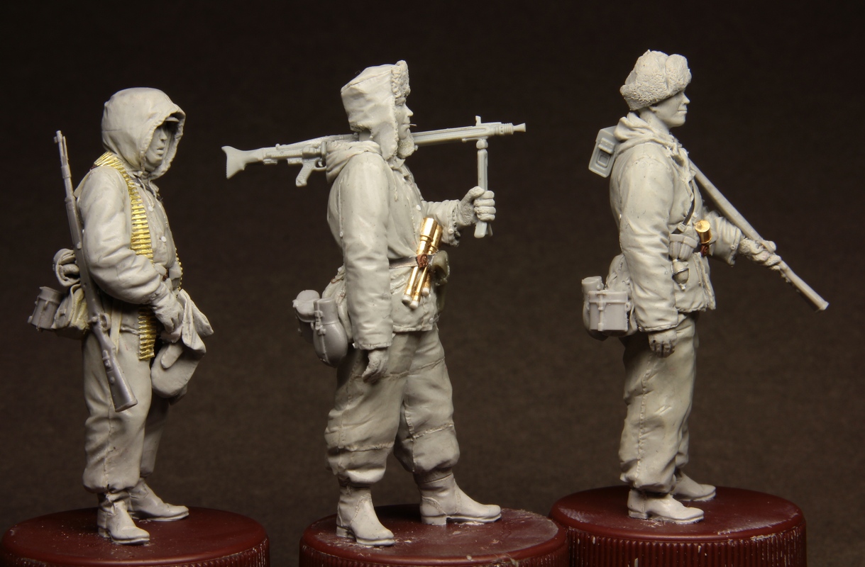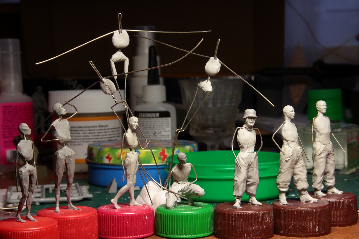 Который глаз потирает - я его уже сделал, он с МР-40. Была мысль сделать его точно как на фото, но хорошенько подумав я отказался от этой мысли. Всё-таки масштаб 1/35 и жанр ВИМ имеет свои ограничения и я совершенно не уверен что эта поза и этот жест смотрелись бы на фигурке и у меня бы хватило мастерства показать так чтобы это выглядело естественно. Ну и коммерческий интерес должен быть принят во внимание. Фигурки будут продаваться в смоле, пока же рынок не готов платить за такую экзотику и не поймет этого. Собственно почему я и не стал делать небритого типа в шинели - не фактурный он, скучноватый. Мысленно отделите его от группы, превратите в фигурку и попробуйте "сфотографировать" одного - нет, не то.