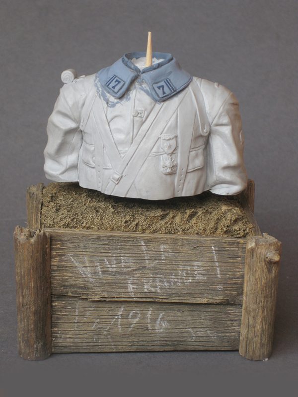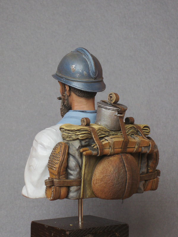 Просто ремни, вырезанные из толщи шинели, даже в 1:35 выглядят несколько плоско, а уж на таком крупном бюсте тем более. Особенно в сочетании с объёмными накладными ремнями на спине миниатюры.