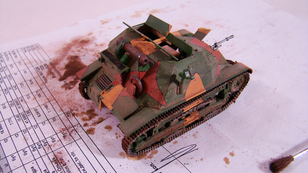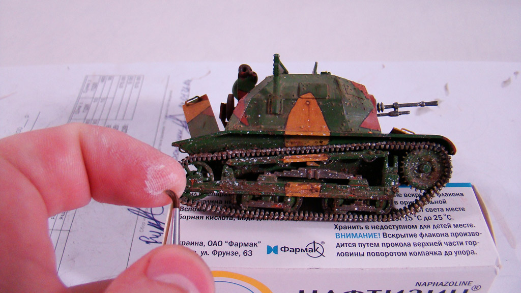 После нанесения грязи,можно даже не дожидаясь пока она засохнет, вся ходовая обильно обрабатывается пигментами от мига P414 Track Brown, а все остальное светлым P232 DRY MUD