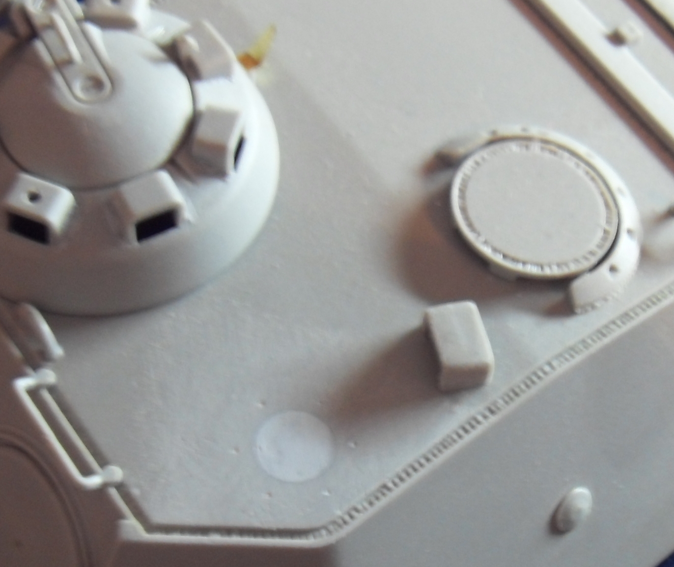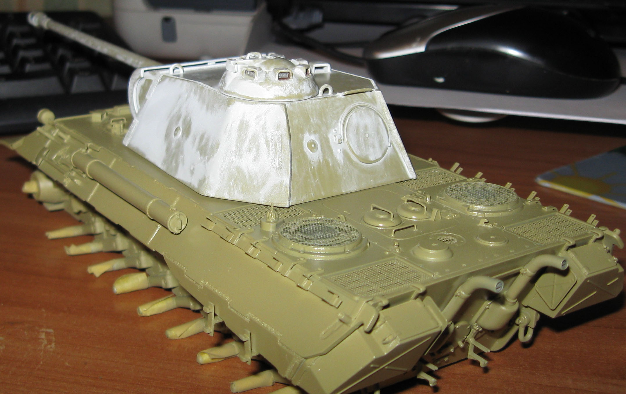 Ну что ж, продолжим. Начал работать с камо. Он полусмытый. Я отказался от метода "лак для волос" и пошел по классическому пути, мне рассудилось, что в моем случае он ближе к прототипу. Предварительно я покрыл модель глянцевым лаком, а потом белым тамиевским акрилом и смывал ватными палочками тамиевским акриловым растворителем. Начал с башни.