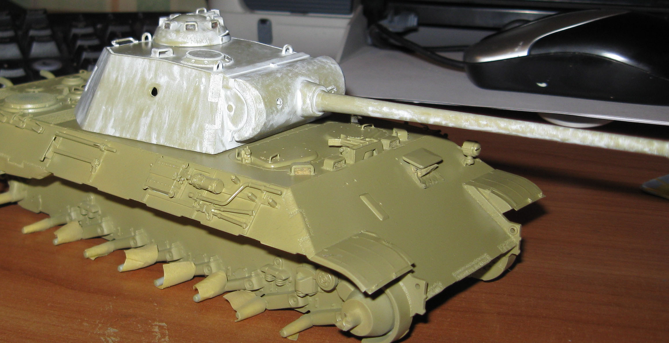 Вот немного пороботал. Зашпаклевал отверстие в башне, осталость добить чуть-чуть. Закончил траки и собрал. Добавил снега на катки.