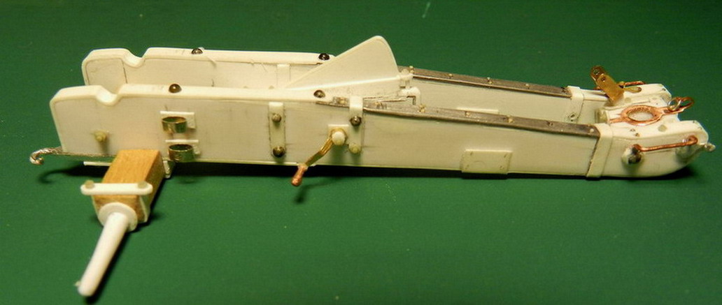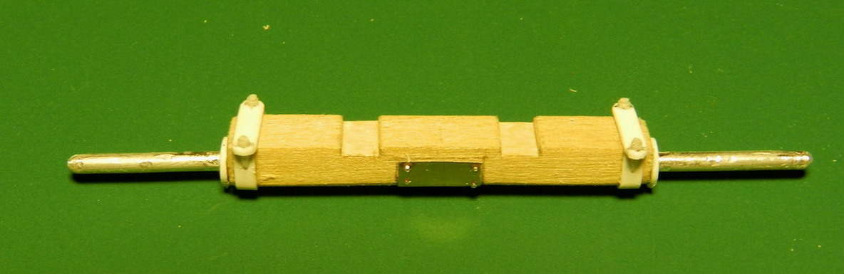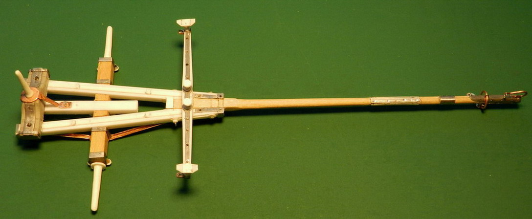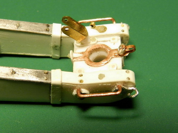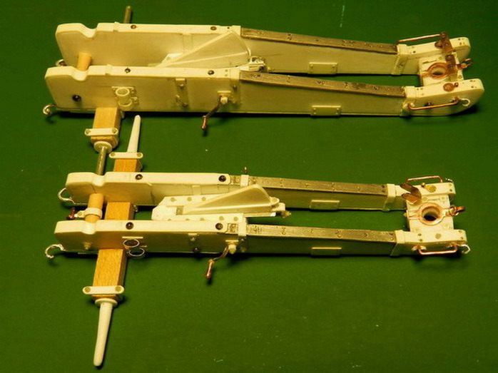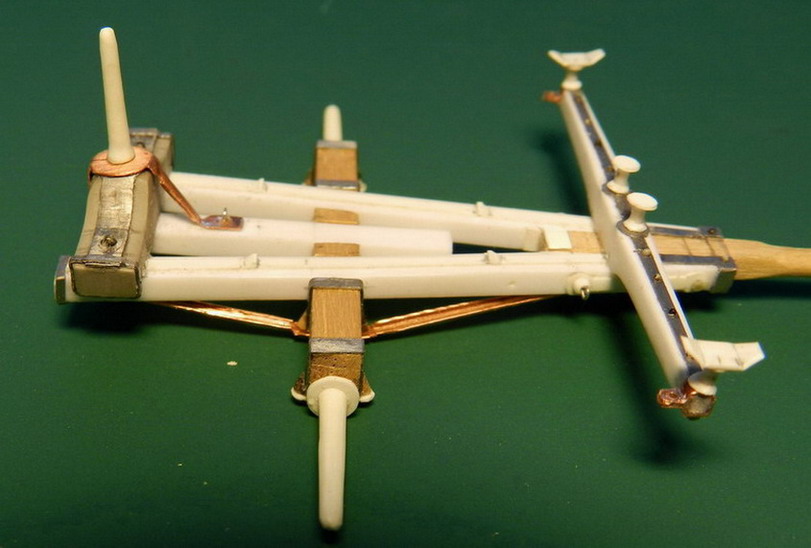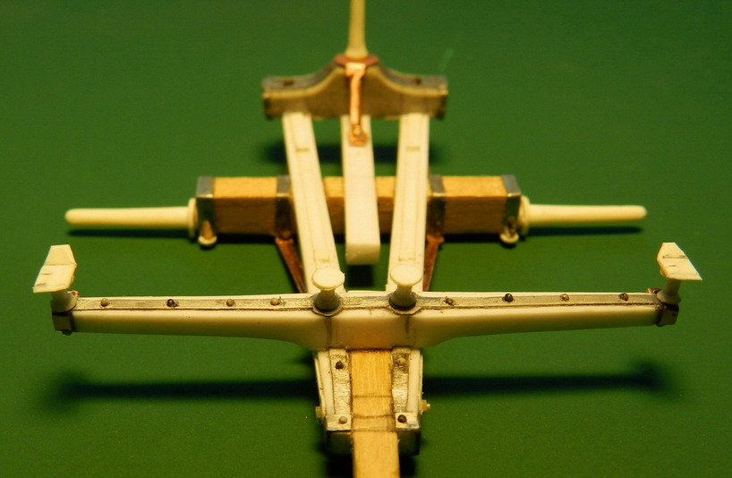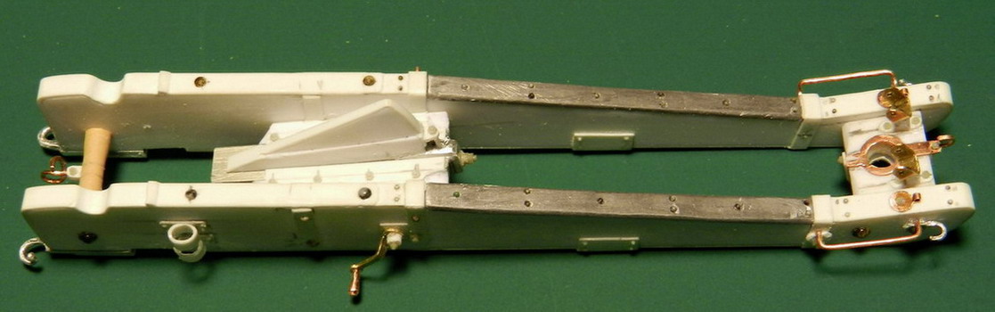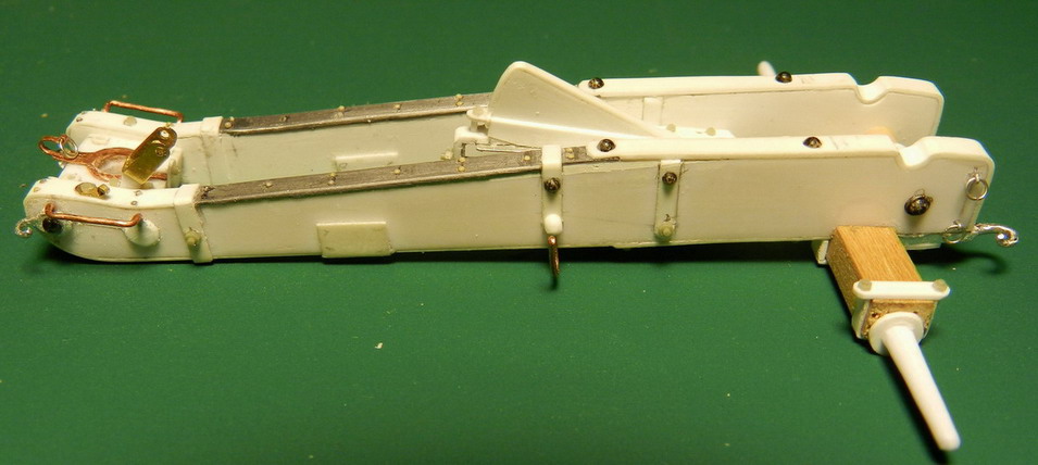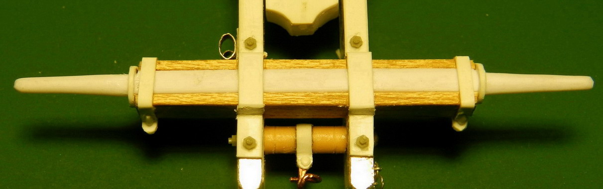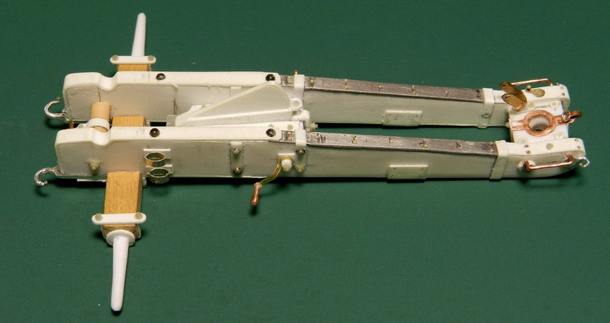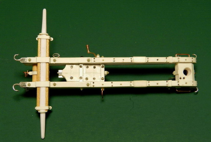 Лопасть оси сделал из дерева (как и в натуре), а вот металлическую вставку оси из двух частей. Квадратную часть из полистирола, а круглые концы из алюминия. Просто иногда полистиролвые концы, при неосторожном обращении ломались в месте соединения с квадратом.Ну я и обезопасился.На ось поставил обоймы и подвязи и вклеил её на лафет, соединив ещё одной подвязью из полистирола.На виде снизу видно как раз две подклиновых подушки и отдельно нижняя часть хоботовой подушки. Она прикрывалась снизу сплошной полосой металла. Для предохранения от истирания шворнем передка.