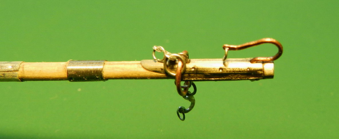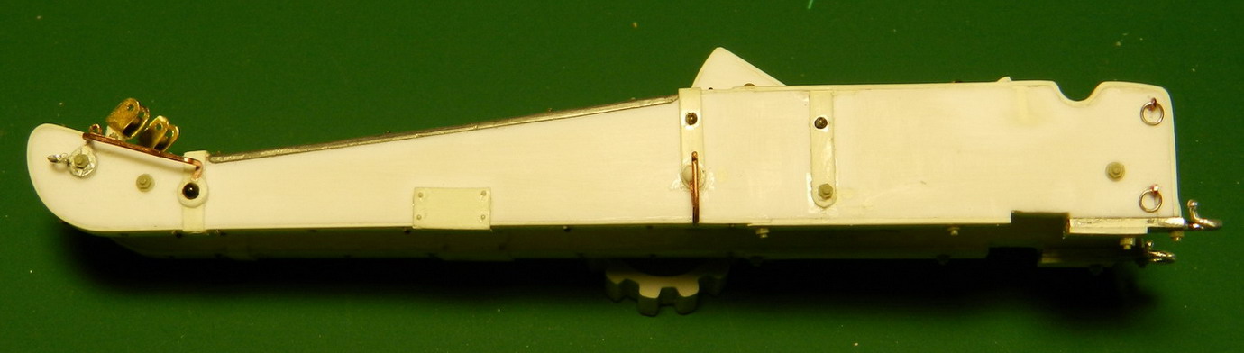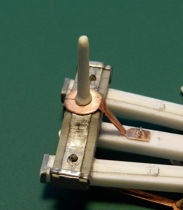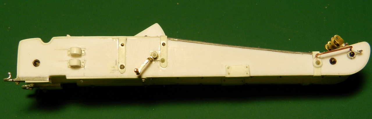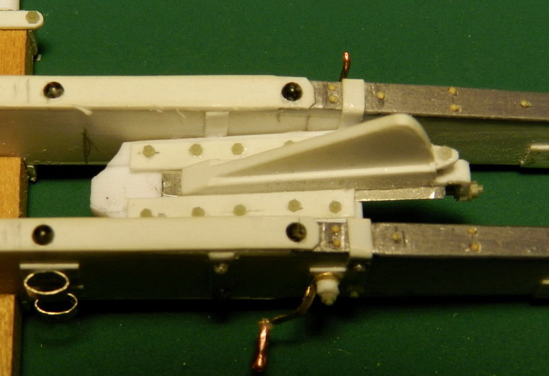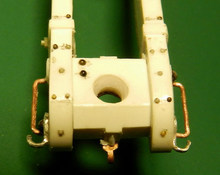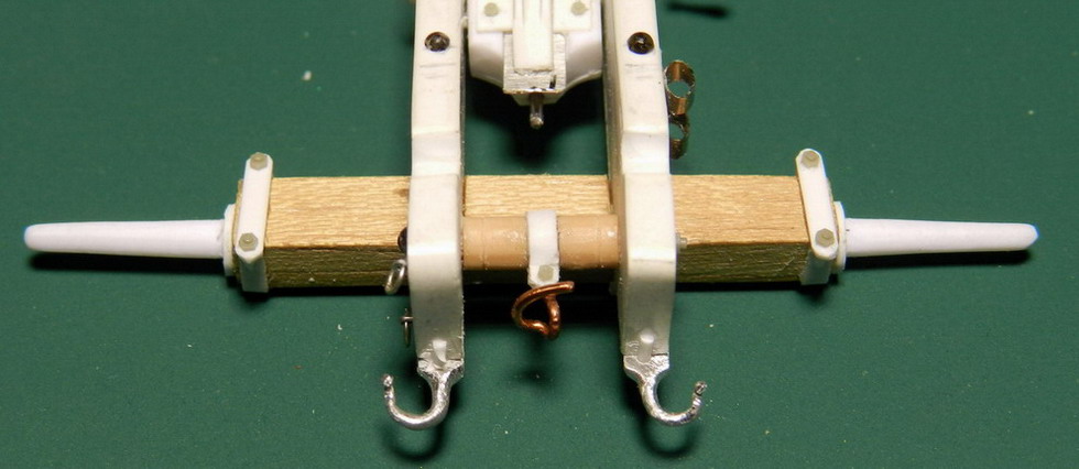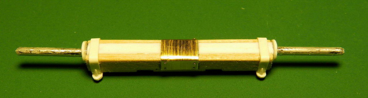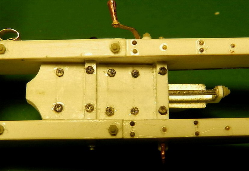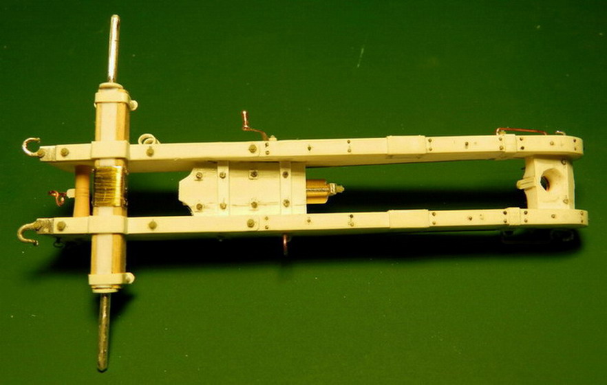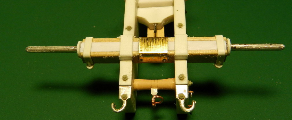 Лопасть оси сделал из дерева (как и в натуре), а вот металлическую вставку оси из двух частей. Квадратную часть из полистирола, а круглые концы из алюминия. Просто иногда полистиролвые концы, при неосторожном обращении ломались в месте соединения с квадратом.Ну я и обезопасился.На ось поставил обоймы и подвязи и вклеил её на лафет, соединив ещё одной подвязью из полистирола.На виде снизу видно как раз две подклиновых подушки и отдельно нижняя часть хоботовой подушки. Она прикрывалась снизу сплошной полосой металла. Для предохранения от истирания шворнем передка.