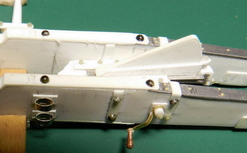 Делая лафет, понял, что даже старые чертёжники допускали ошибки. На одном из старых чертежей на виде сбоку подклиновая доска показана цельной, ну я её и сделал цельной,а потом уже глянул на вид сбоку и чертежи более раннего времени. Оказалось, их было две. Попытался отделить резцом, но склеенное тамиевским клеем не поддавалось. Лучшим средством для разделения склееных деталей оказался молоток. Один точный удар и всё разлетелось. Правда по новой пришлось сверлить крепёжные отверстия, но справился.Для начала показываю виды лафета сбоку и сверху.Почти все гайки мастерклубовские, а вот заклёпки делал сам.Причём как простые головки, тк и сподкладочными шайбами.Приприклеивани полистироловых заклёпок на метал, по разметке маленьким сверлом в мнстах их крепления делал углубление, туда капельку циана и заклёпочку. Держит хорошо.